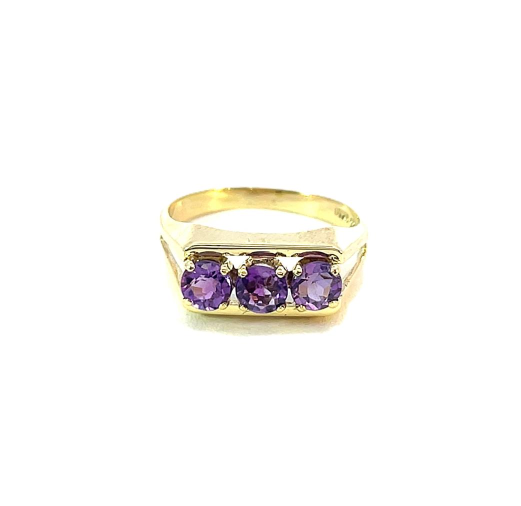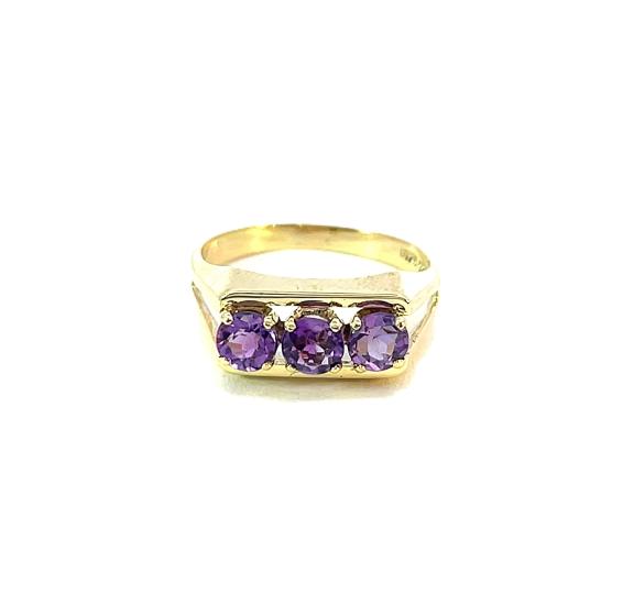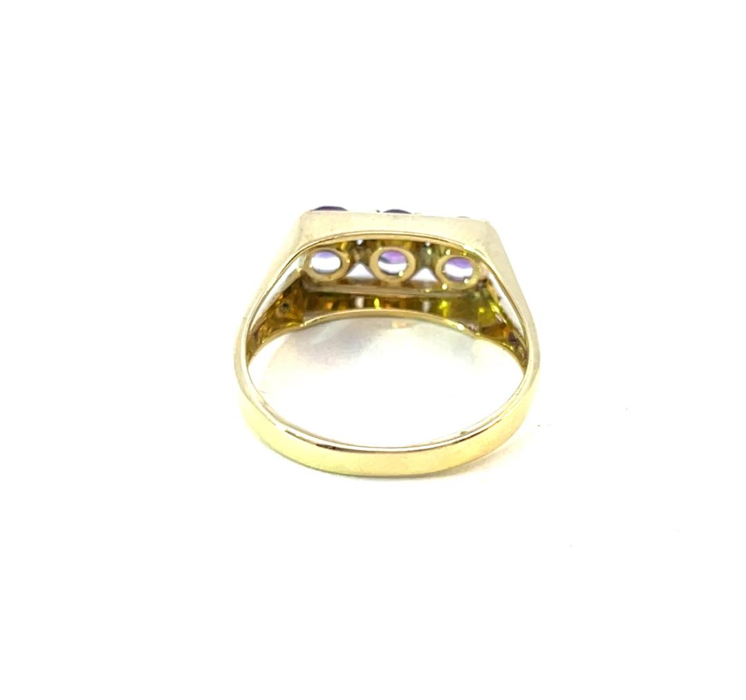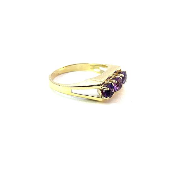 Zlatý prsten o ryzosti 585/1000, punc labuť. Váha 3,79 g, velikost 57, v nejširíšm bodě 7 mm. Kameny jsou syntetické.