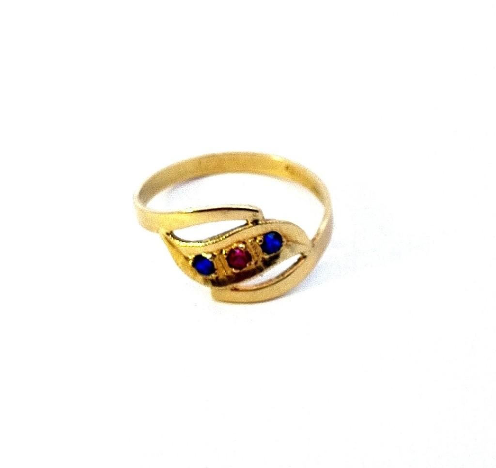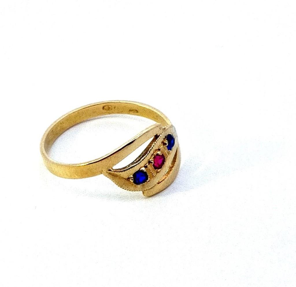 Zlatý prsten o ryzosti 585/1000, punc labuť. Velikost 50, váha 1,66 g, šířka hlavy prstenu v nejširším bodě 10 mm. Kameny jsou syntetické.