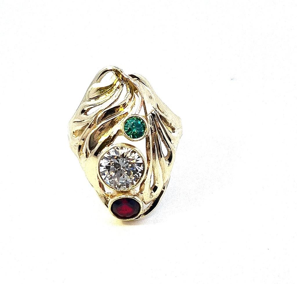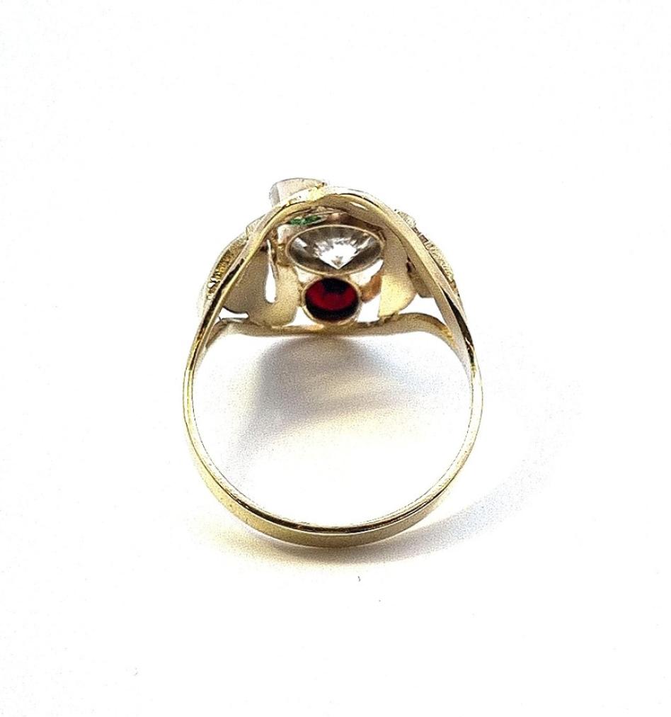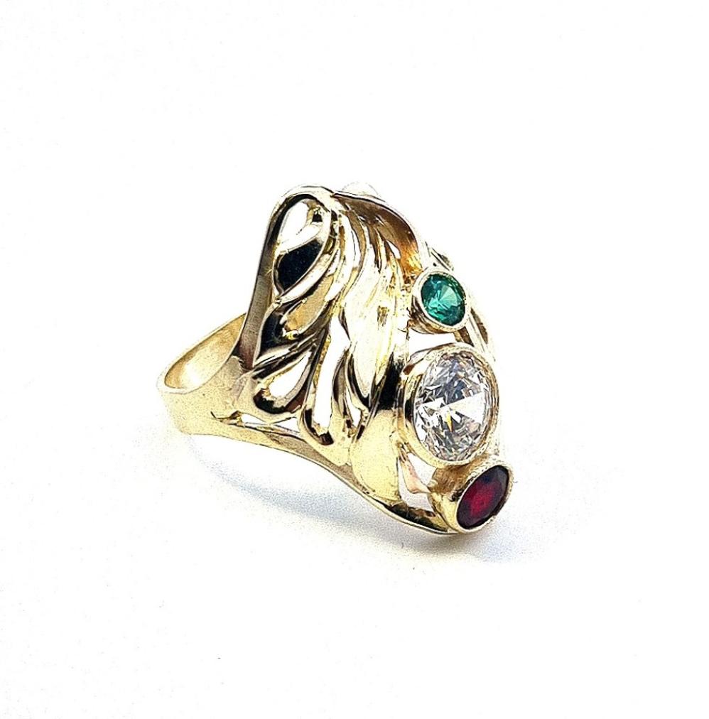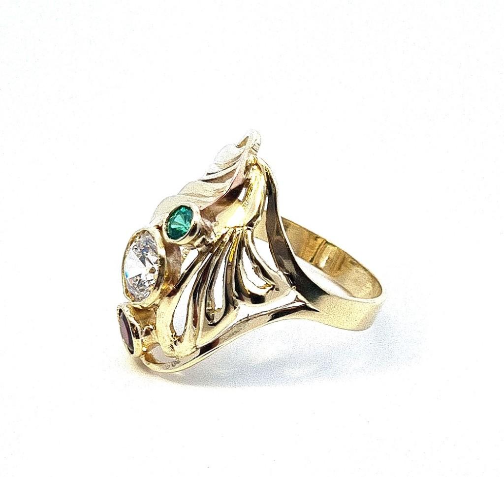 Zlatý prsten o ryzosti 585/1000, punc labuť , váha 5,50 g, velikost 57, v nejširším bodě 25 mm, průměr největšího kamene (zirkon) - 7 mm.