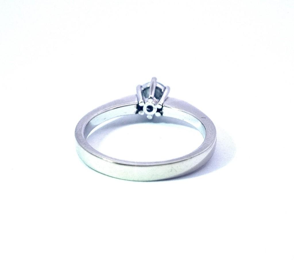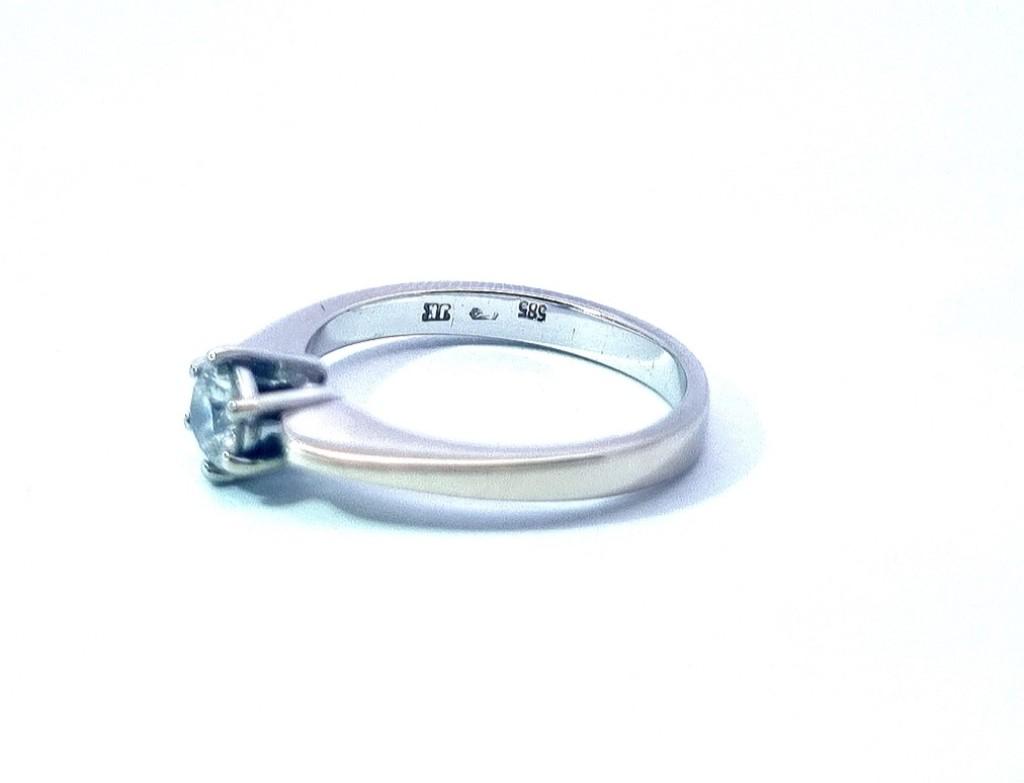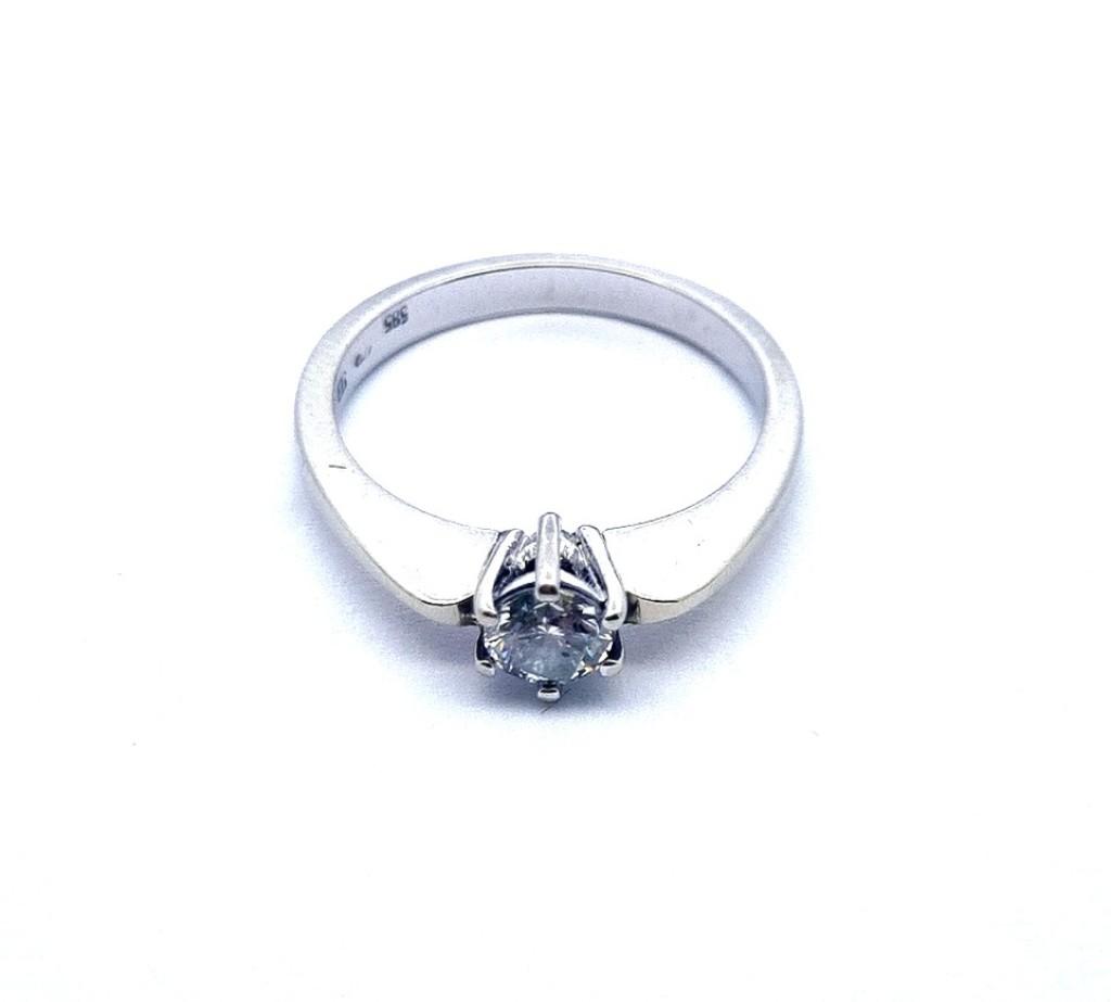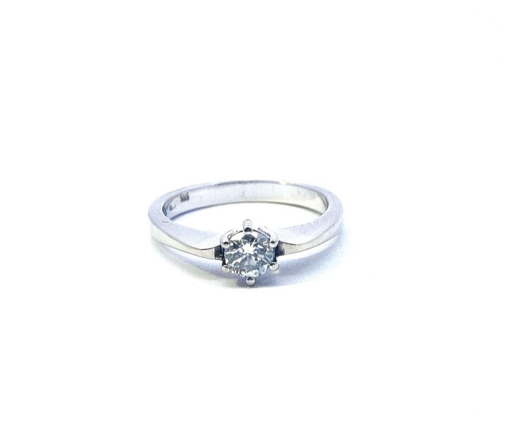 Prsten z bílého zlata 585/1000, punc labuť, váha 3,49 g, velikost prstenu 53,5, přírodní diamant briliantového brusu 0,35 ct.