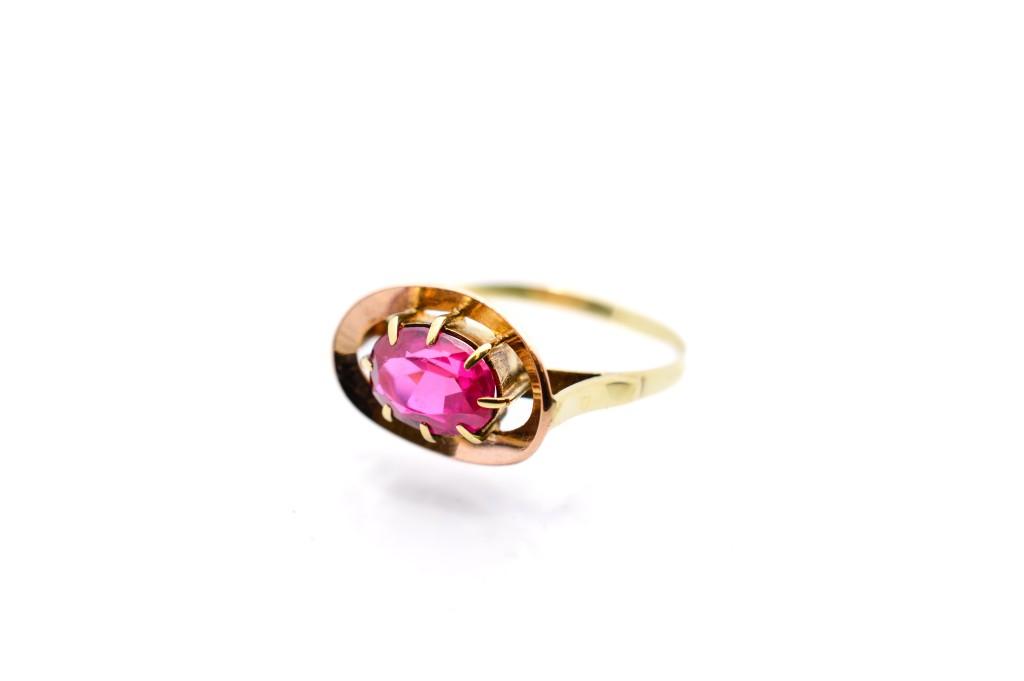 Zlatý prsten o ryzosti 585/1000, punc čejka, váha 1,95 g, velikost 52,5, v nejširším bodě 10 mm. Kámen je syntetický.