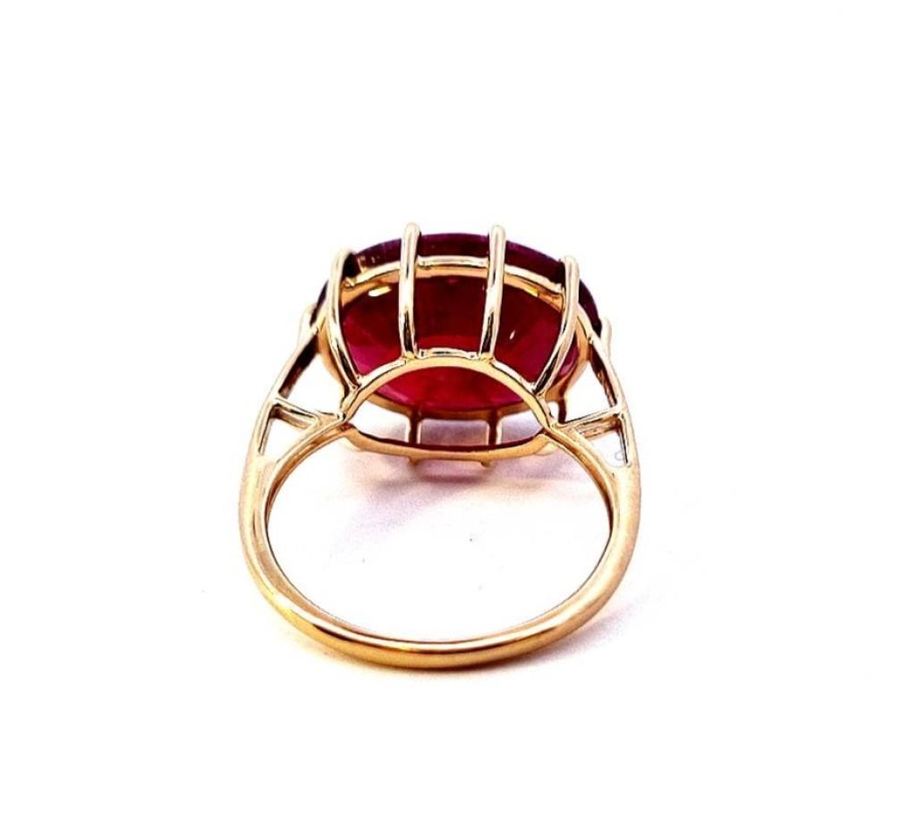 Zlatý prsten o ryzosti 585/1000, punc labuť. Velikost 54, váha 4,62 g, rozměry kamene 13 x 18 mm. Kámen je syntetický.