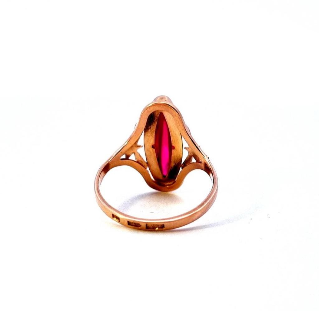 Zlatý prsten o ryzosti 585/1000, punc labuť. Velikost 56, váha 3,47 g, rozměr kamene 19 x 7 mm. Kámen je syntetický.