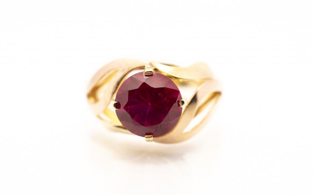 Zlatý prsten o ryzosti 585/1000, punc čejka, váha 4,42 g, velikost 57, v nejširším bodě 11 mm (průměr kamene)