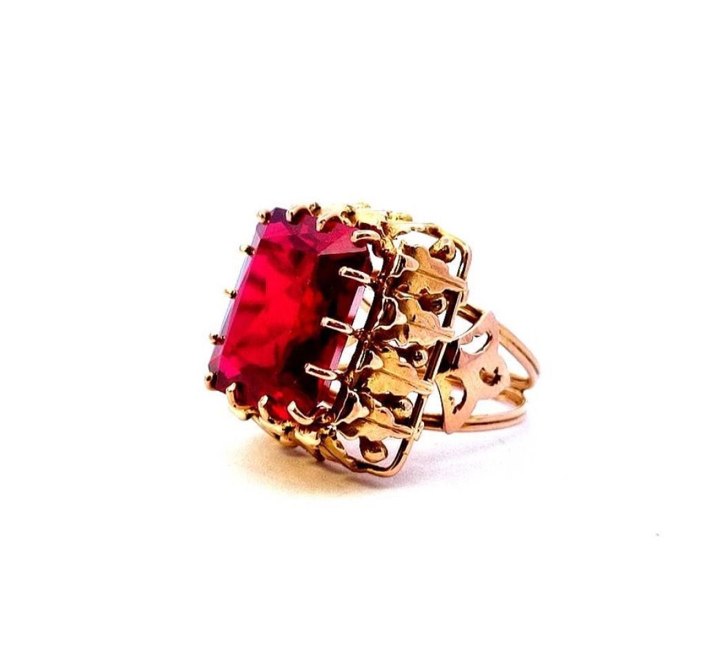 Zlatý prsten o ryzosti 750/1000, punc kohout. Velikost 58, váha 13,68 g, rozměr hlavy prstenu 23 x 21 mm, rozměr kamene 17 x 15,5 mm. Kámen je syntetický.
