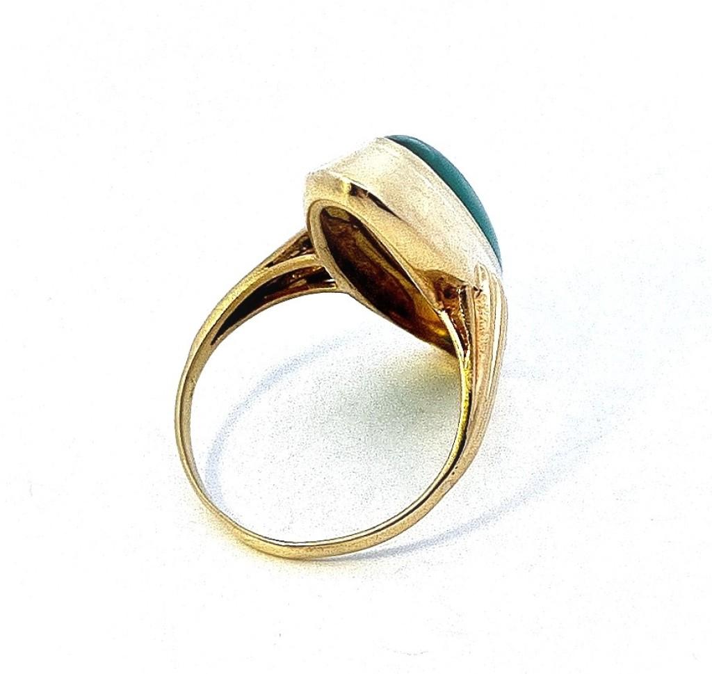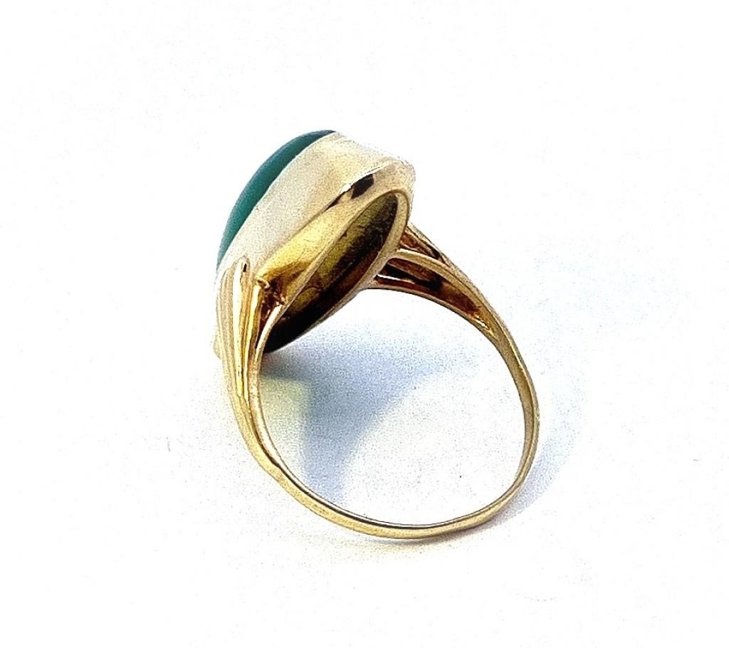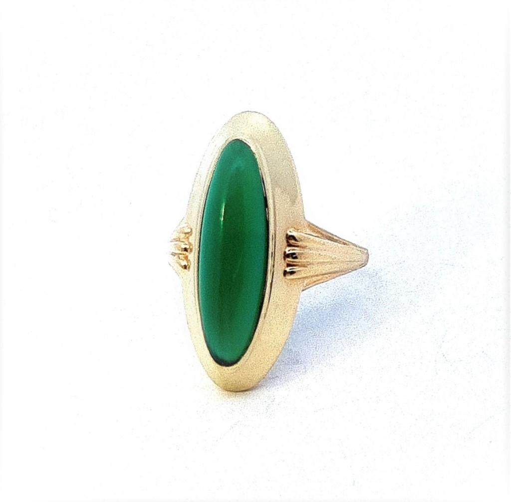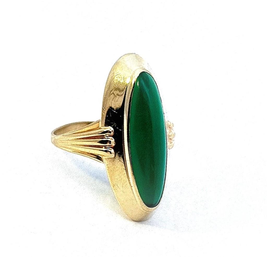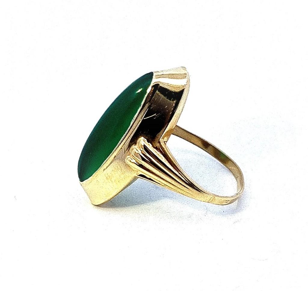 Zlatý prsten o ryzosti 585/1000, punc labuť, váha 3,71 g, velikost 54, v nejširším bodě 26 mm, rozměry kamene - výška 20 mm, šířka 7 mm. Kámen trochu kloktá.