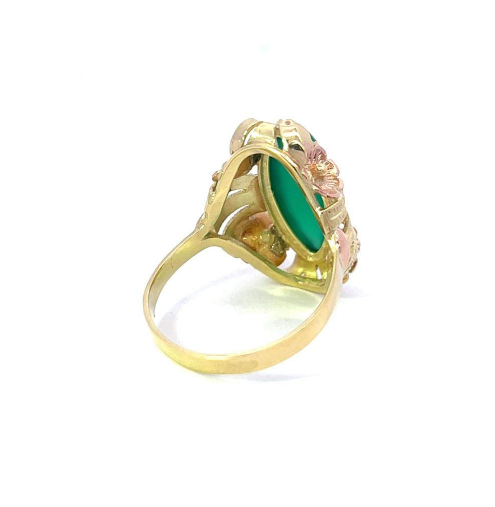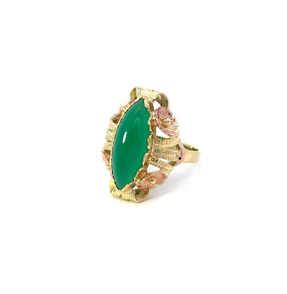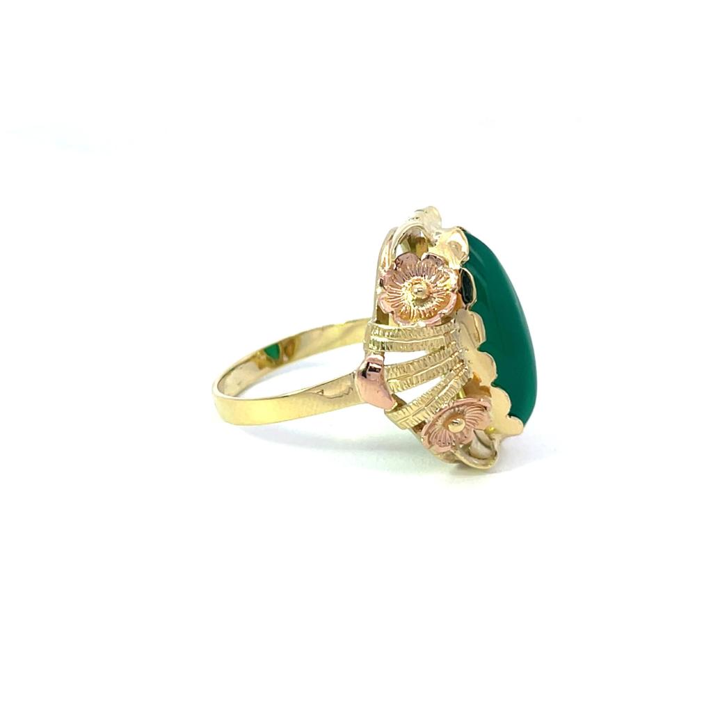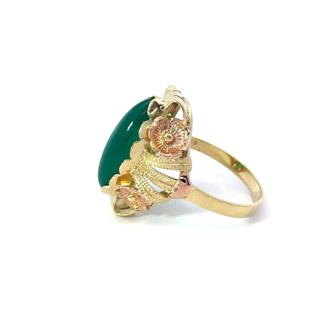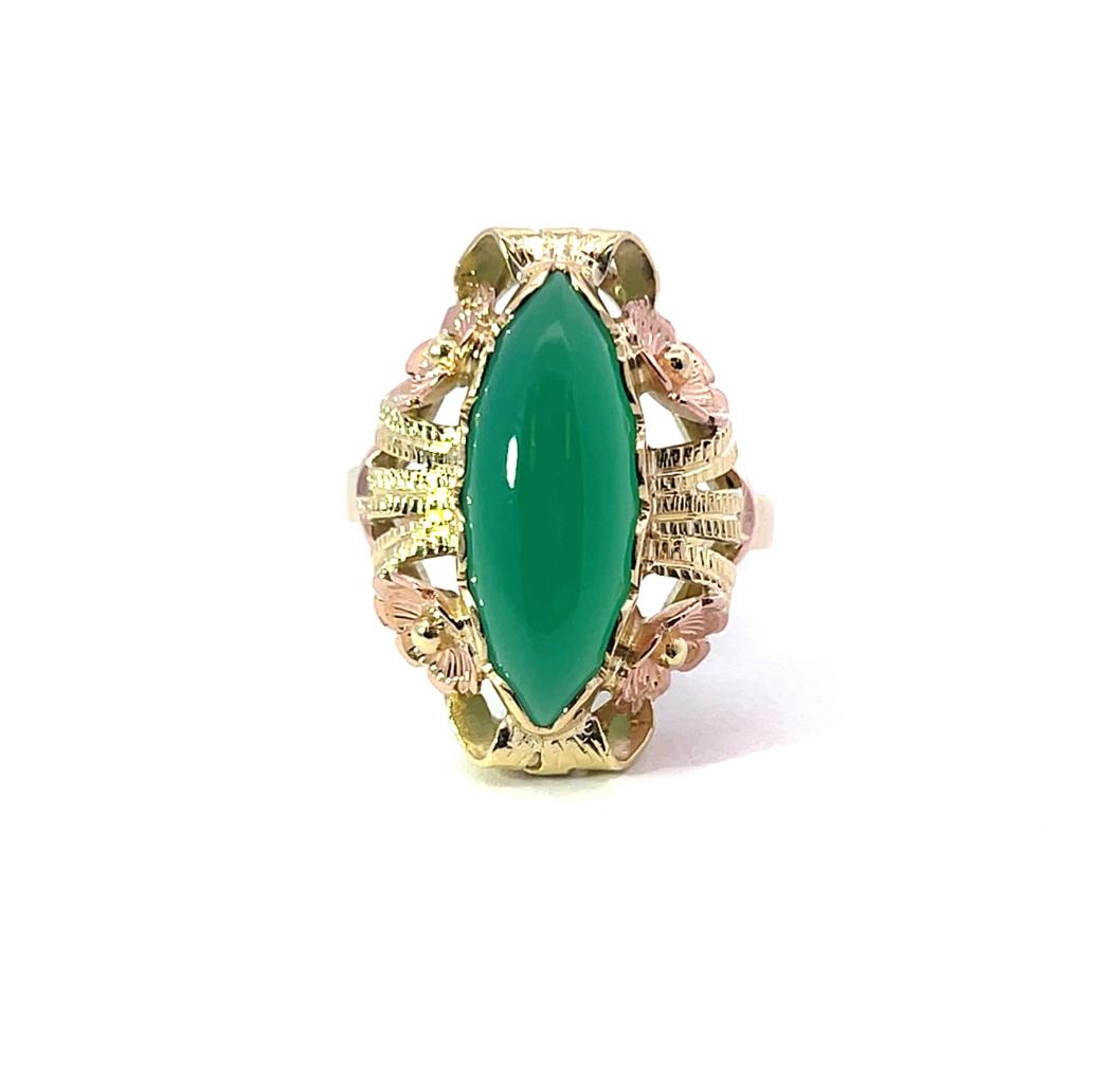 Prsten z kombinace žlutého a růžového zlata o ryzosti 585/1000, punc labuť. Váha 5,83 g, velikost 59, rozměr hlavy prstenu 23 x 17,5 mm.