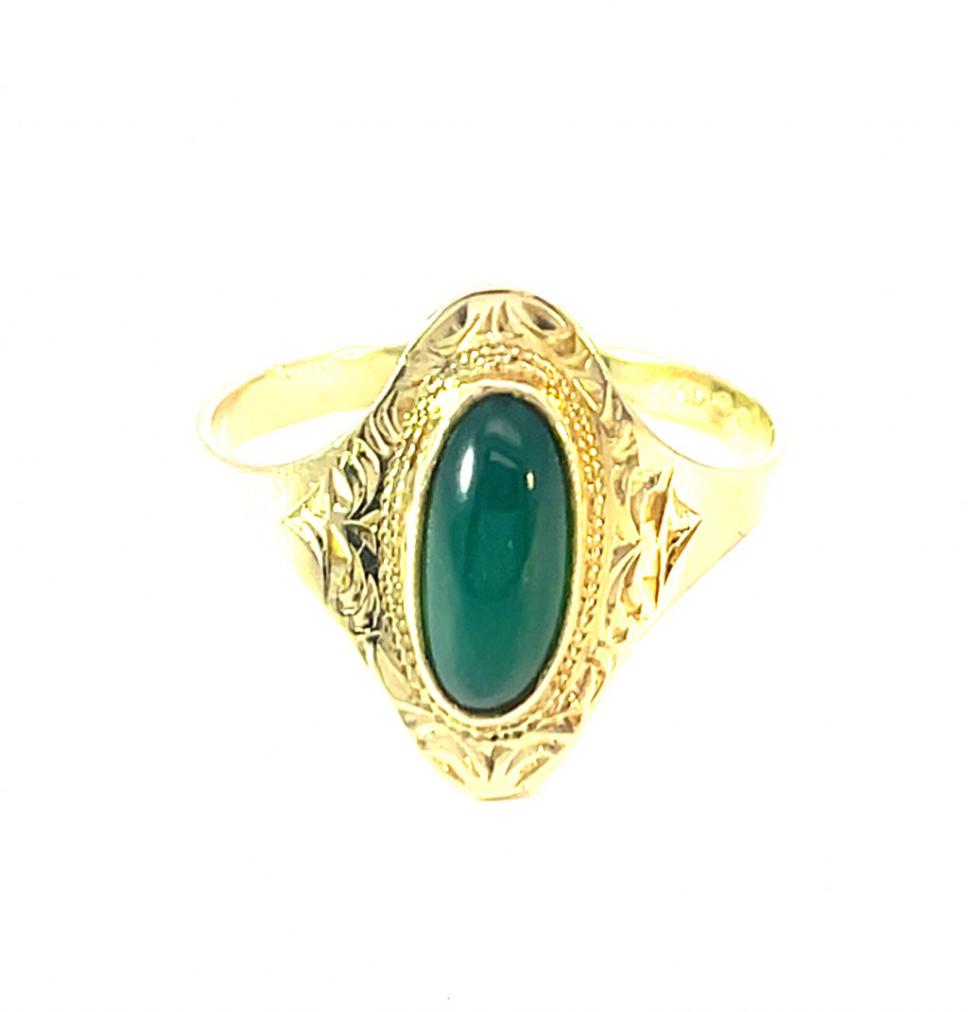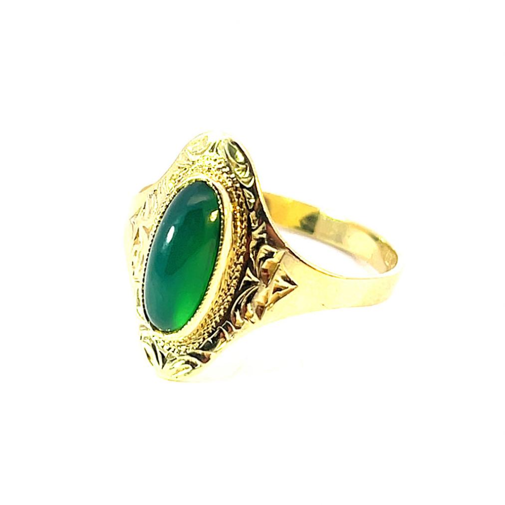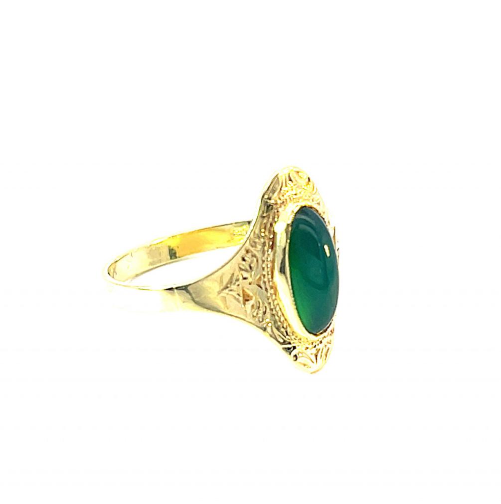 Zlatý prsten o ryzosti 585/1000, punc labuť. Velikost 60, váha 3,07 g, v nejširším bodě 17,5 mm, rozměr kamene 12 x 6 mm.