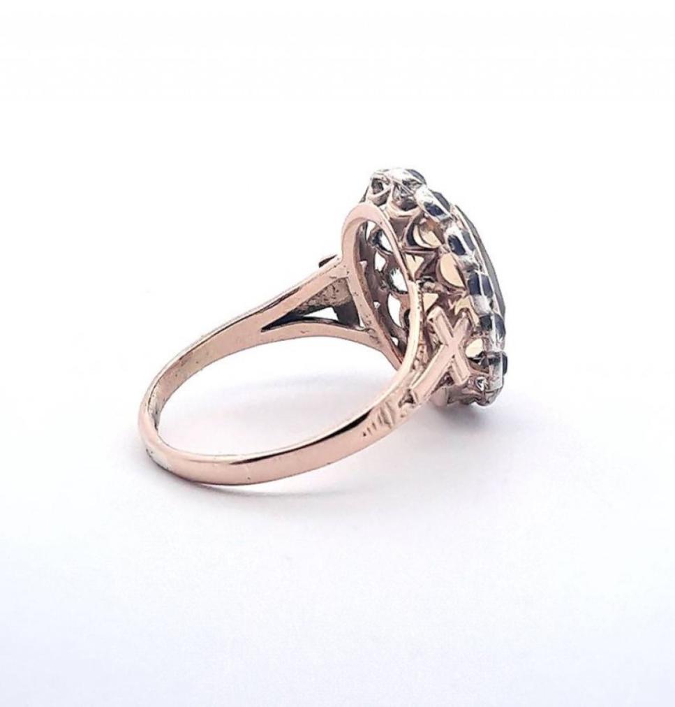 Zlatý prsten o ryzosti 585/1000, punc labuť. Velikost 73, váha 8,80 g, rozměr hlavy prstenu 24 x 18 mm. Kameny jsou syntetické.
