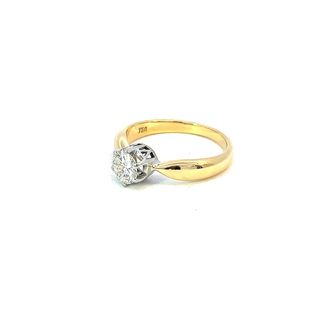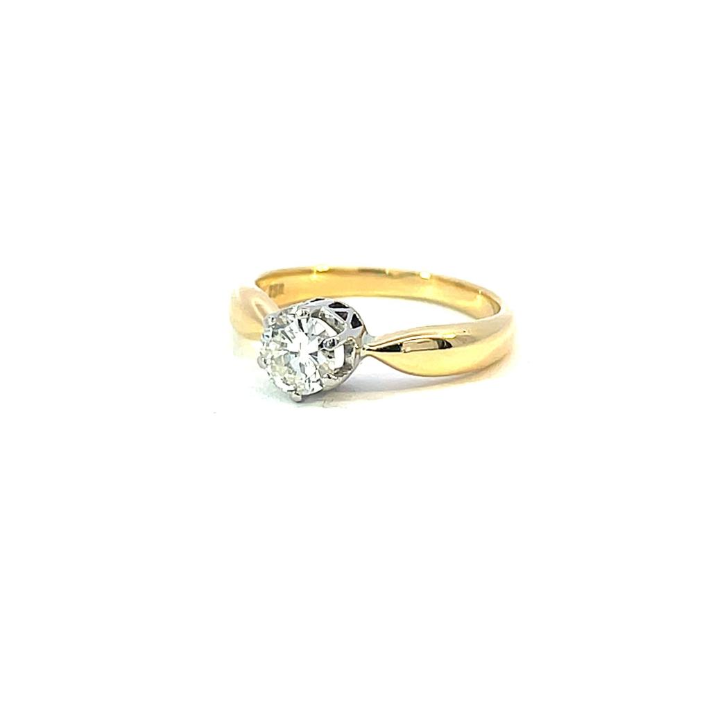Prsten z kombinace žlutého a bílého zlata o ryzosti 750/1000, punc kohout. Velikost 53, váha 4,19 g, v nejširším bodě 6,5 mm. Kámen - přírodní diamant briliantového brusu - 1 ks, cca 0,50 ct.