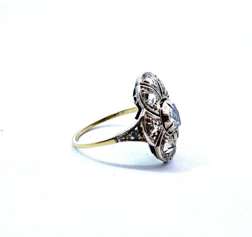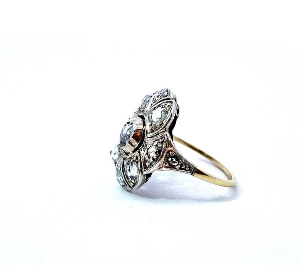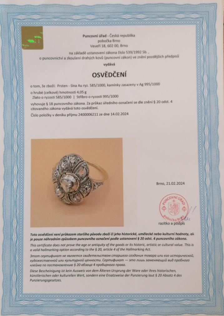 Zlatý prsten o ryzosti 585/1000, kamínky zasazeny do stříbra o ryzosti 995/1000, osvědčení z PÚ. Velikost 56, váha 4,05 g, rozměr hlavy prstenu 20,5 x 17 mm. Kámen - přírodní diamant routa - celkem 11 ks.