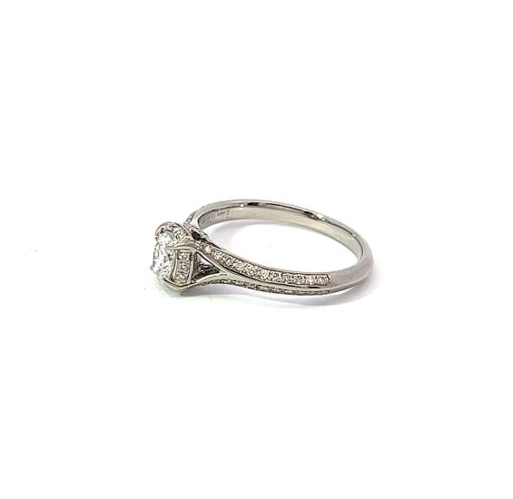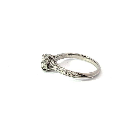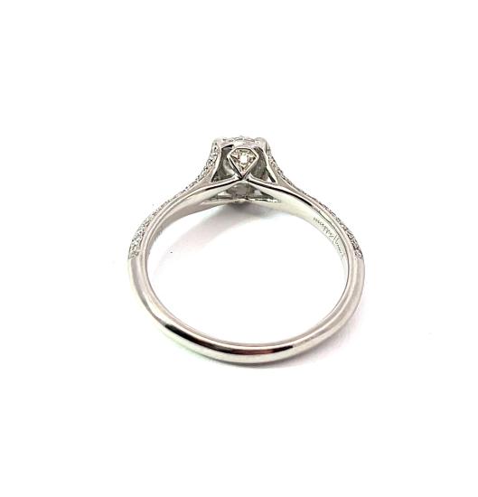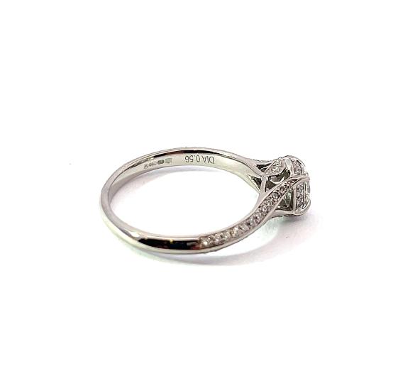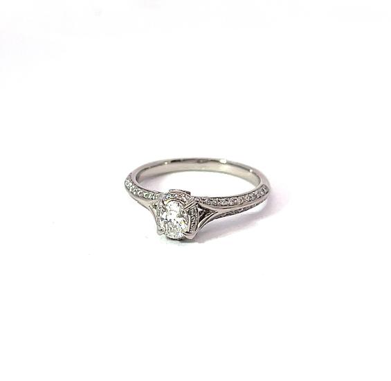Prsten z bílého zlata o ryzosti 750/1000, značka vídeňské konvence + londýnský punc. Velikost 55, váha 3,64 g, v nejširším bodě 7 mm. Kámen - přírodní diamant oválného brusu - 1 ks, přírodní diamant briliantového brusu - 52 ks - dohromady cca 0,56 ct. Zevnitř vyrytý nápis, nejspíše jméno zlatníka.
