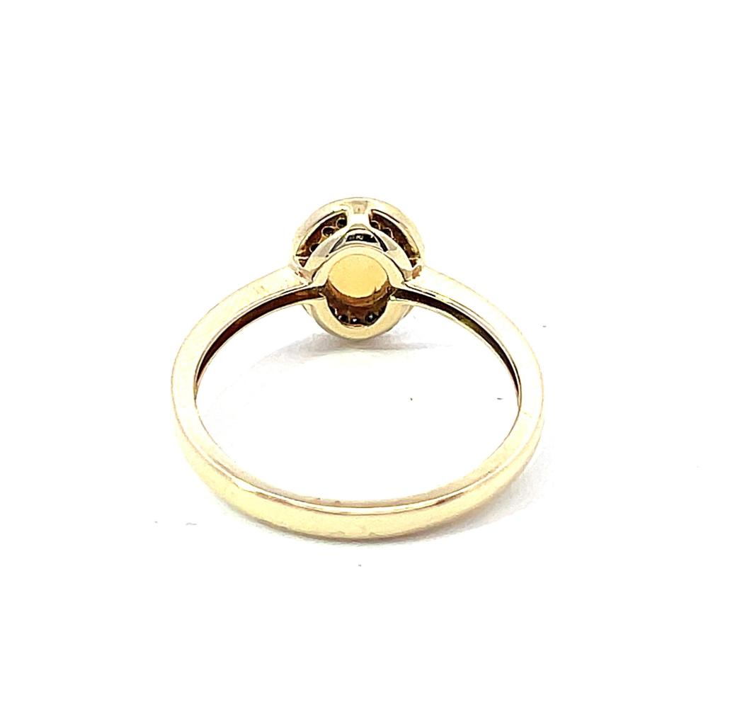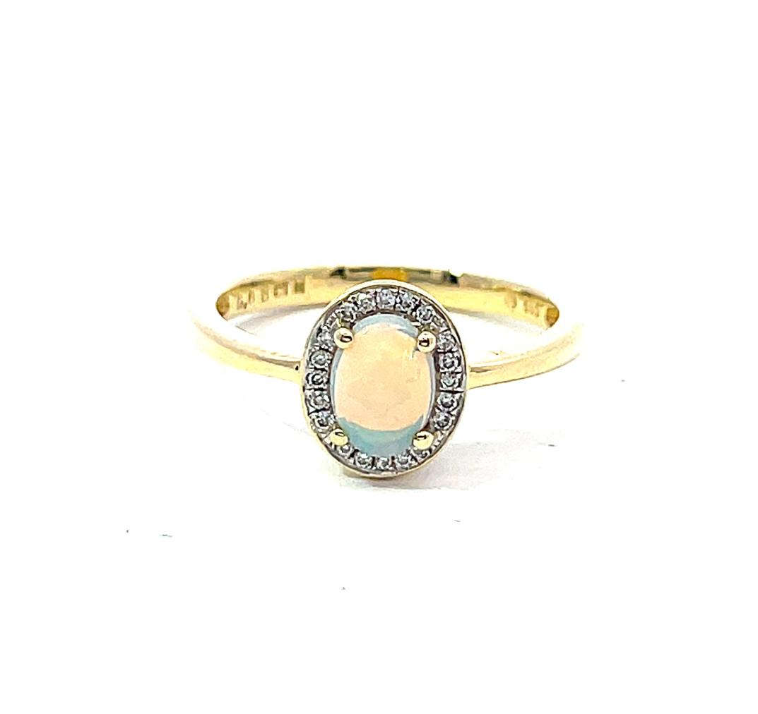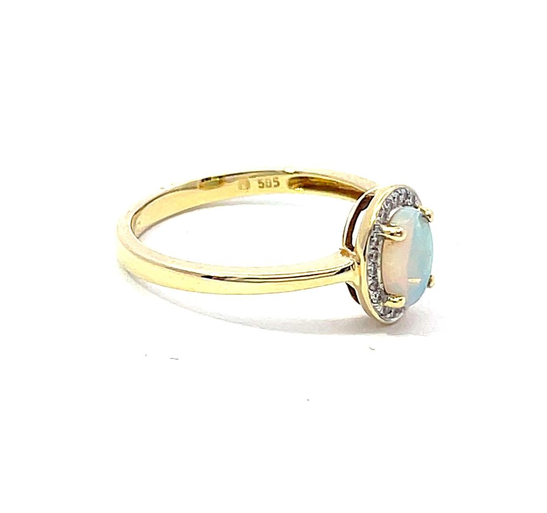 Prsten z kombinace žlutého a bílého zlata o ryzosti 585/1000, punc labuť. Velikost 56, váha 2,80 g, rozměr hlavy prstenu 10 x 8 mm. Kámen - syntetický opál - 1 ks. Kámen - přírodní diamant briliantového brusu - 20 ks, cca 0,004 ct každý - dohromady cca 0,08 ct. Kousek opálu je uštípnutý.