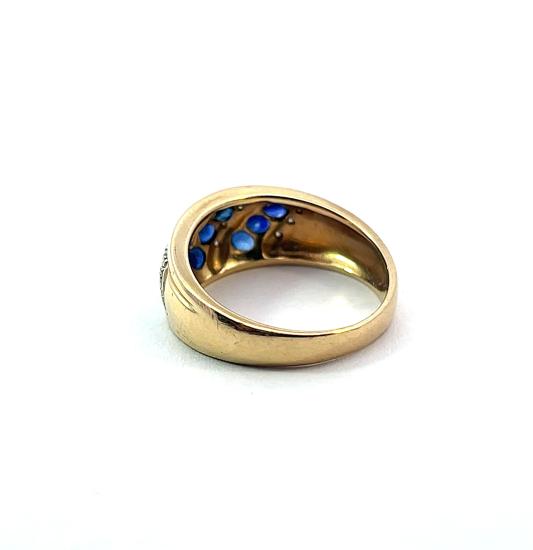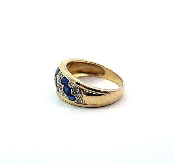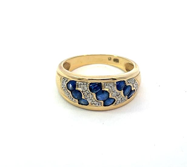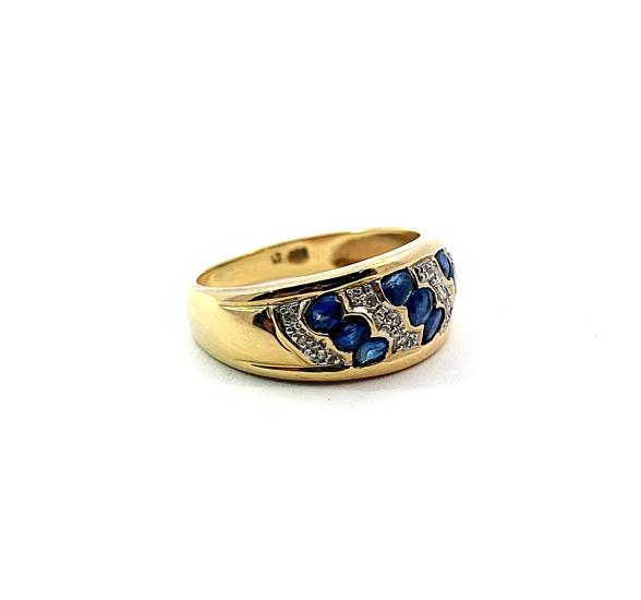 Prsten z kombinace žlutého a bílého zlata o ryzosti 585/1000, punc labuť. Velikost 54, váha 4,40 g, v nejširším bodě 8 mm. Kámen - syntetický safír - 9 ks. Kámen - přírodní diamant briliantového brusu - 12 ks, cca 0,005 ct každý - dohromady cca 0,06 ct.