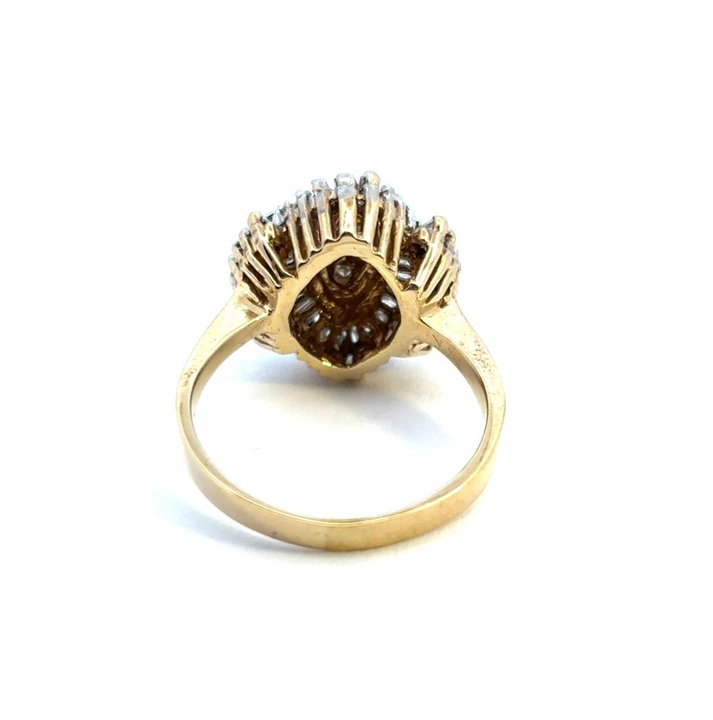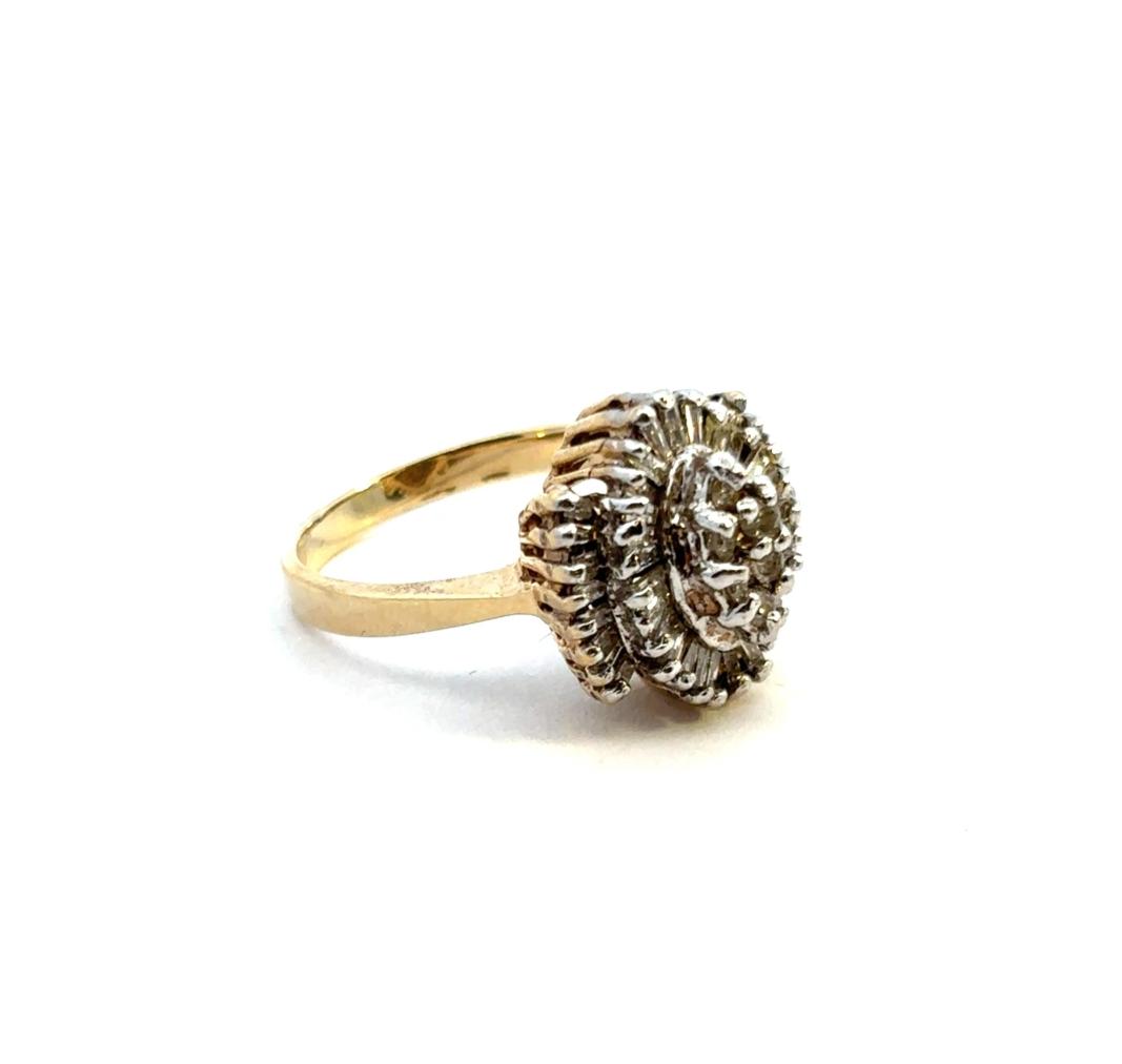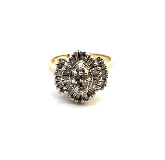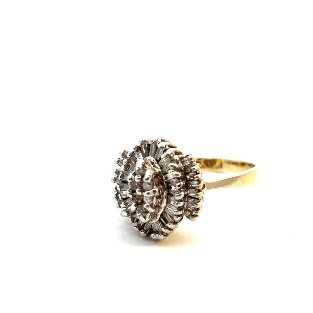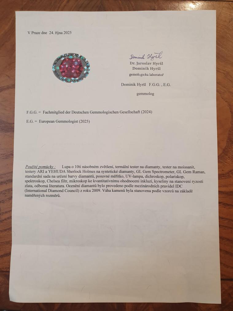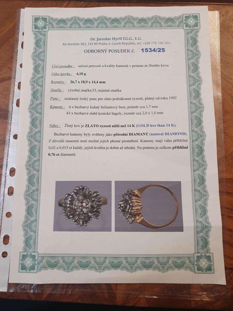 Prsten z kombinace žlutého a bílého zlata o ryzosti 416/1000, punc Z a slunce. Velikost 52, váha 4,11 g, rozměr hlavy prstenu 14,5 x 14,5 mm. Kámen - přírodní diamant briliantového brusu - 6 ks, cca 0,01 ct každý. Kámen - přírodní diamant brusu baguette - 43 ks. Celkem je na prstenu cca 0,76 ct diamantů.