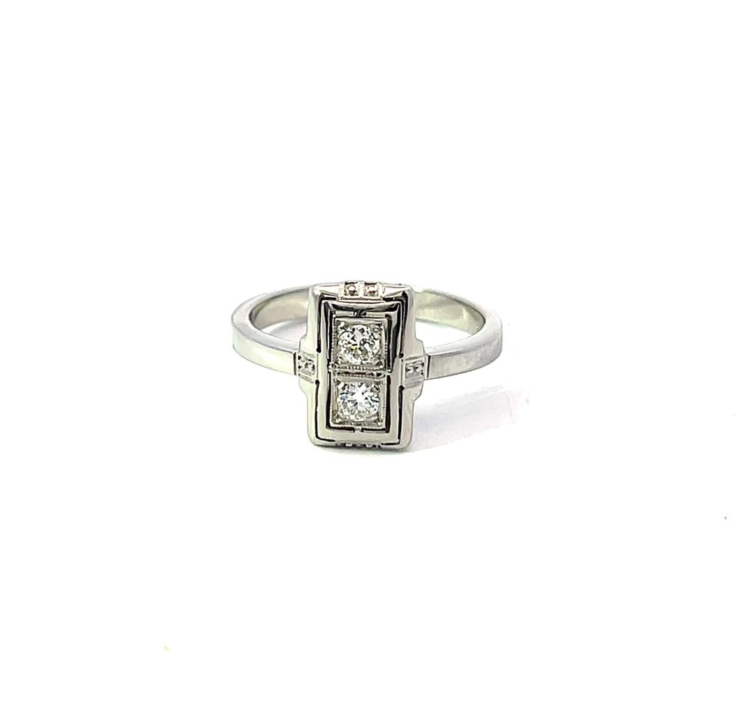 Prsten z bílého zlata o ryzosti 585/1000, punc labuť. Váha 2,88 g, velikost 54, rozměr hlavy prstenu 12 x 9 mm. Kámen - přírodní diamant briliantového brusu - 2 ks, cca 0,08 ct každý - dohromady cca 0,16 ct.