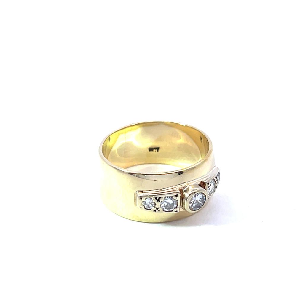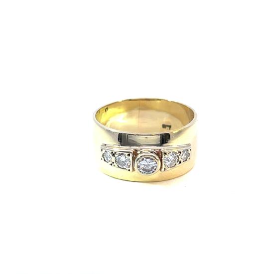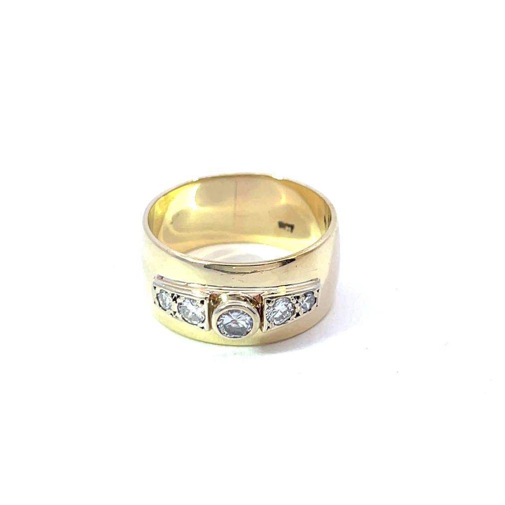 Zlatý prsten o ryzosti 390/1000, punc Z a slunce. Váha 6,47 g, velikost 56, v nejširším bodě 9 mm. Kámen - přírodní diamant briliantového brusu - 5 ks, centrální kámen: 1 ks, cca 0,15 ct, ostatní kameny: 4 ks, cca 0,28 ct dohromady - celkem cca 0,43 ct.