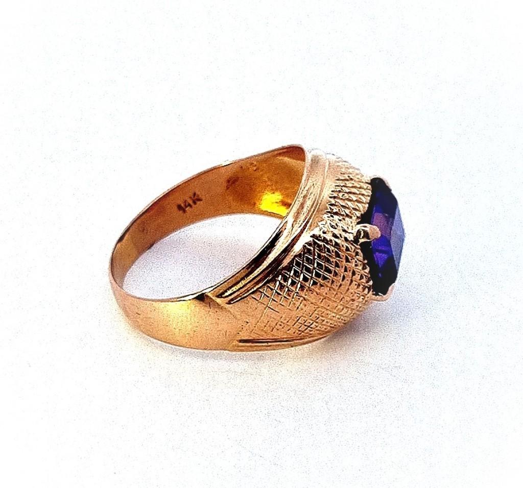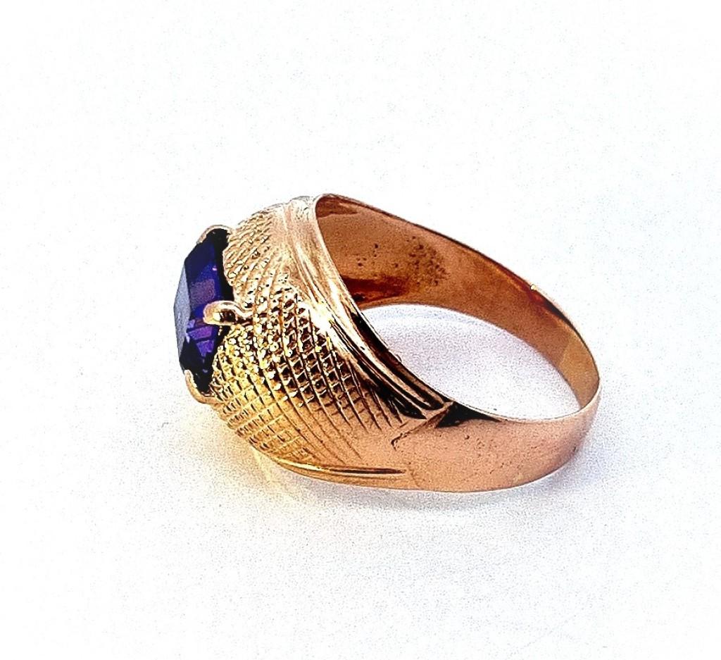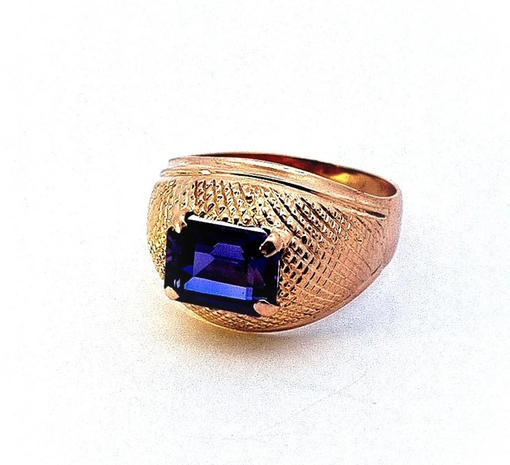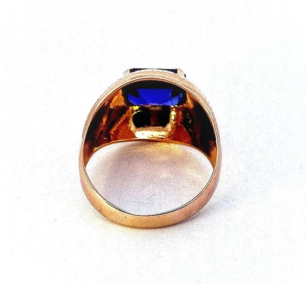 Zlatý prsten o ryzosti 585/1000, punc labuť, váha 3,92 g, velikost 56, v nejširším bodě 14 mm. Rozměry kamene - výška 7 mm, šířka 9 mm. Kámen je syntetický.