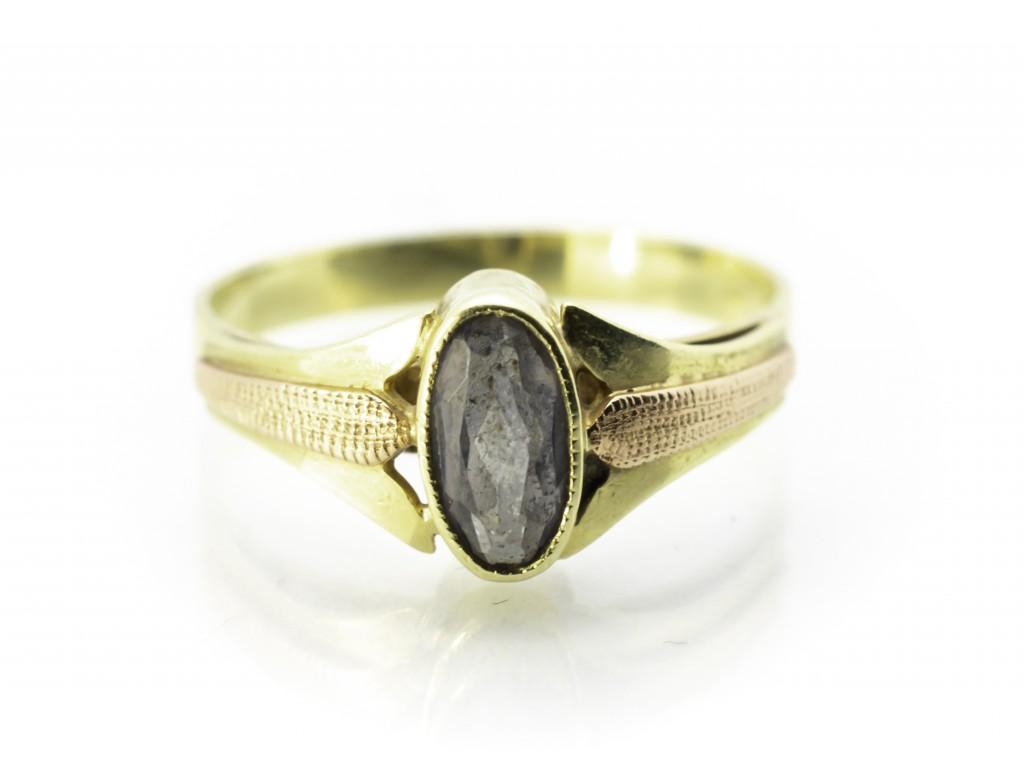 Zlatý prsten o ryzosti 585/1000, punc čejka, váha 2,90 g, velikost 55, v nejširší bodě 9 mm.
