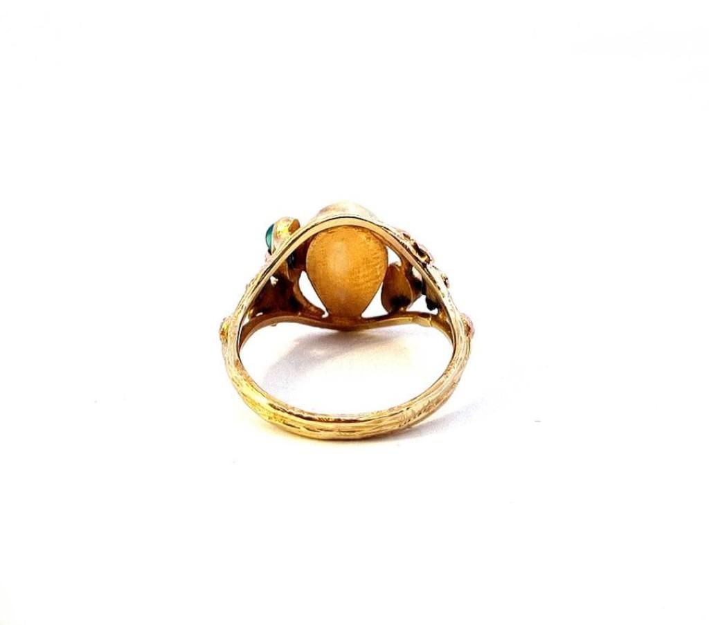 Zlatý prsten o ryzosti 585/1000, punc čejka. Velikost 53, váha 3,20 g, v nejširším bodě 13 mm.