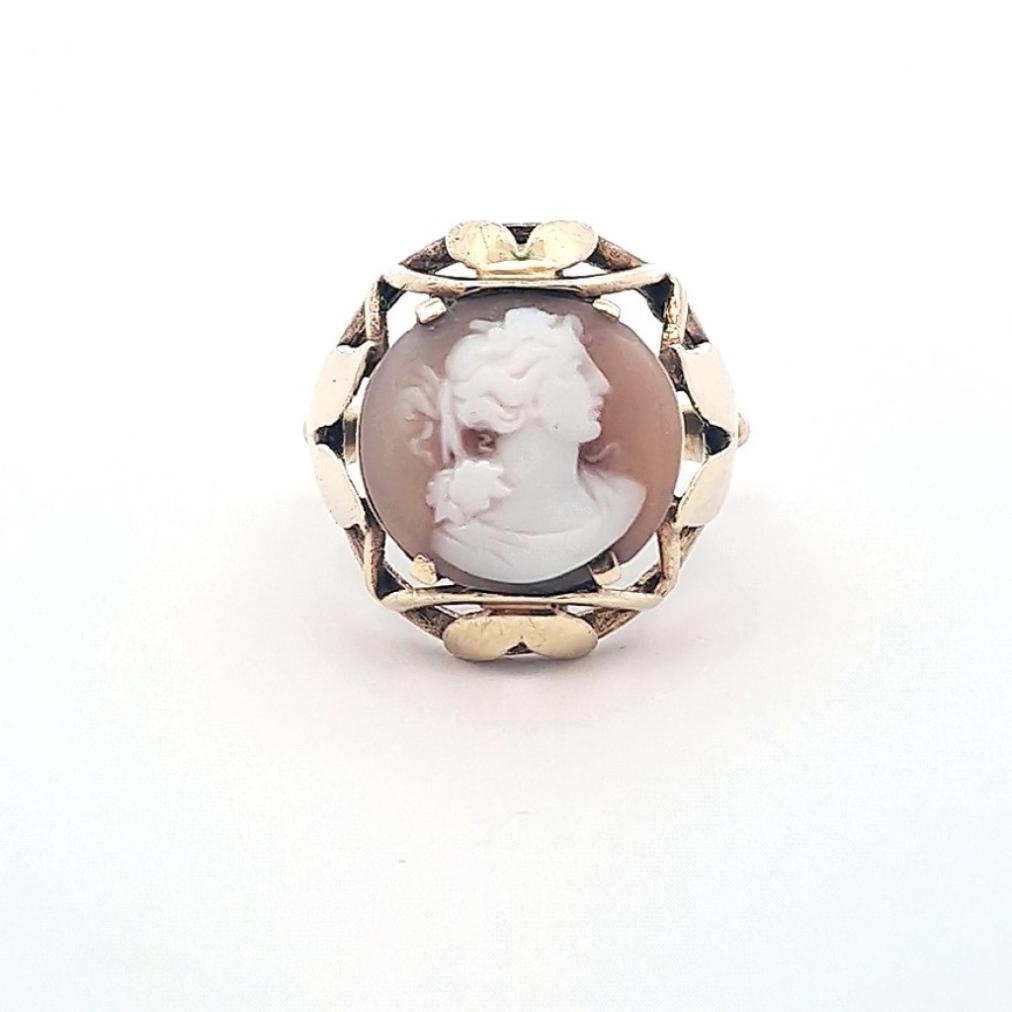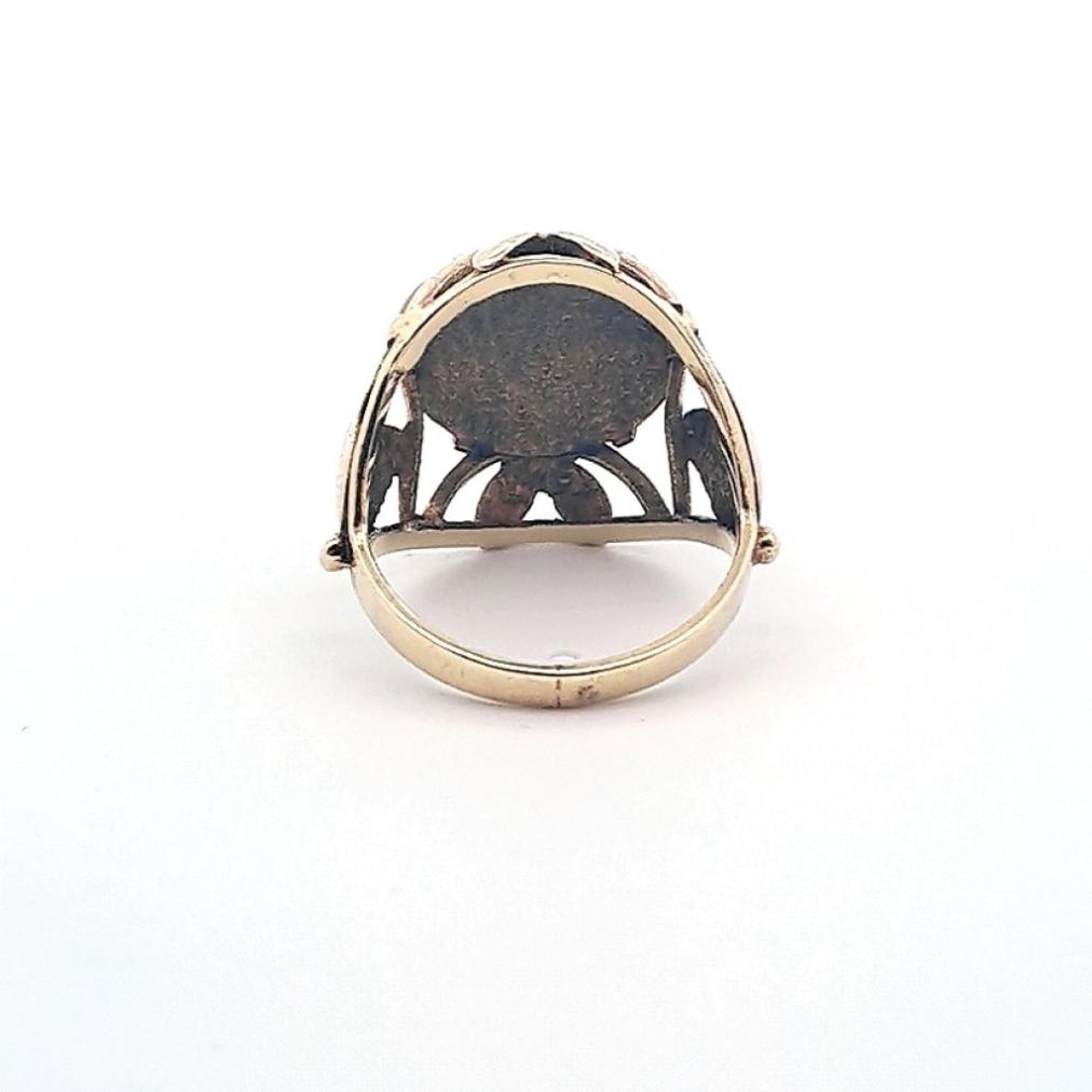 Zlatý prsten o ryzosti 585/1000, punc labuť. Velikost 53, váha 5,44 g, šířka hlavy prstenu v nejširším bodě 20 mm, průměr kameje 14 mm.