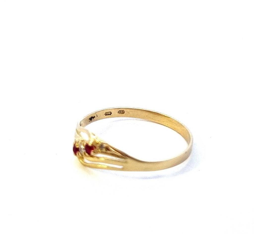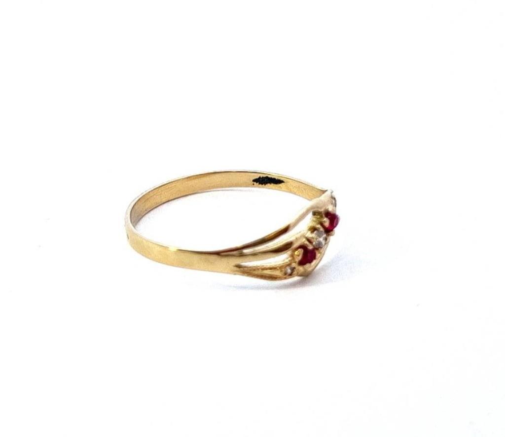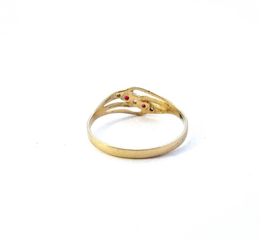 Zlatý prsten o ryzosti 585/1000, punc labuť. Velikost 57, váha 1,21 g, šířka v nejširším bodě 7 mm. Kameny jsou syntetické.