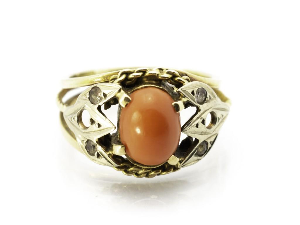 Zlatý prsten o ryzosti 585/1000, váha 5,37 g, vel. 54, punc lyra, korál 7 x 9 mm.