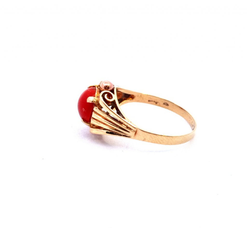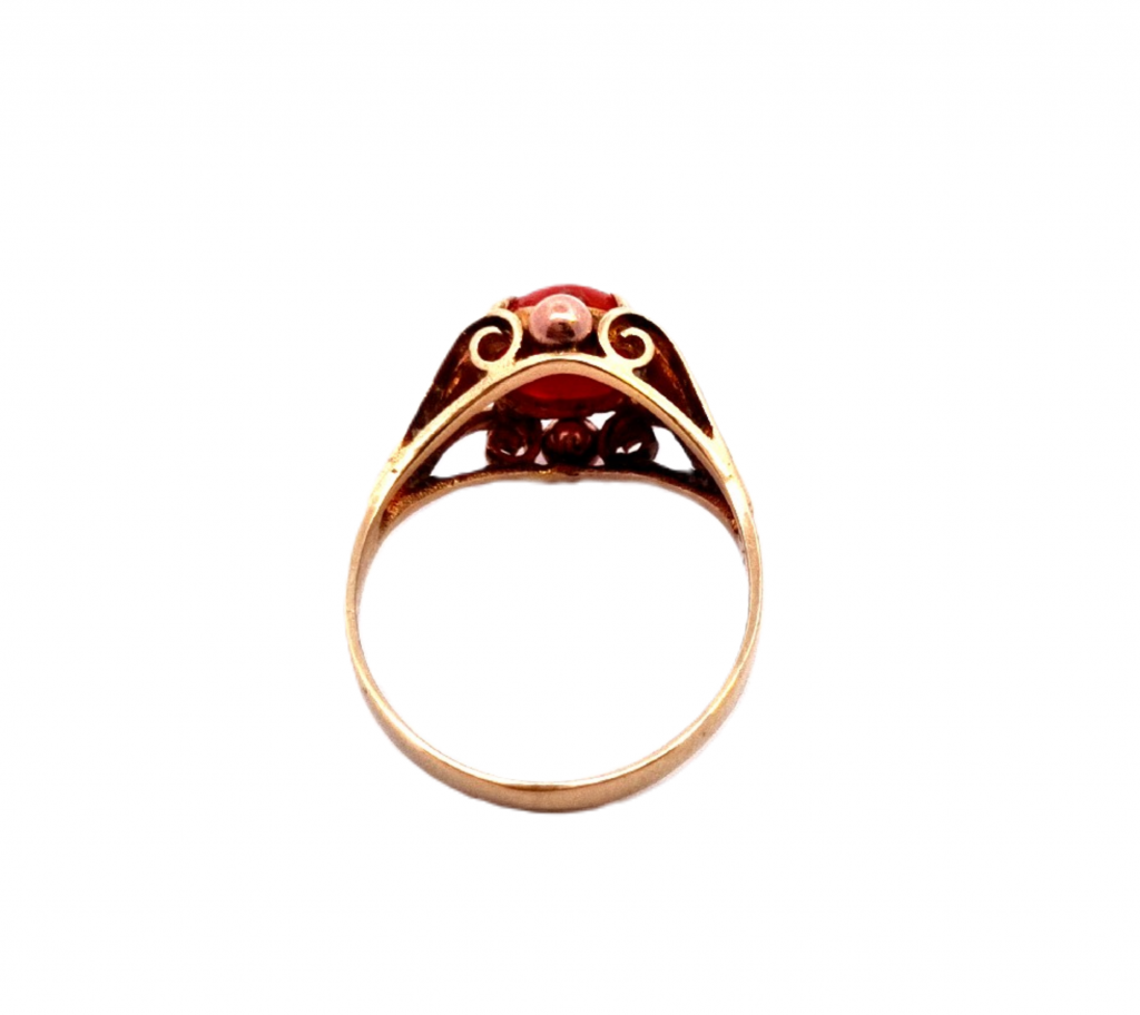 Prsten ze žlutého zlata s usazeným korálem o ryzosti 585/1000 s puncem labuť. Po stranách kamene jsou dvě malé kuličky z růžového zlata. Velikost hlavy prstenu v nejširším bodě je 13 mm, průměr kamene je 8 mm. Váha je 2,96 g.