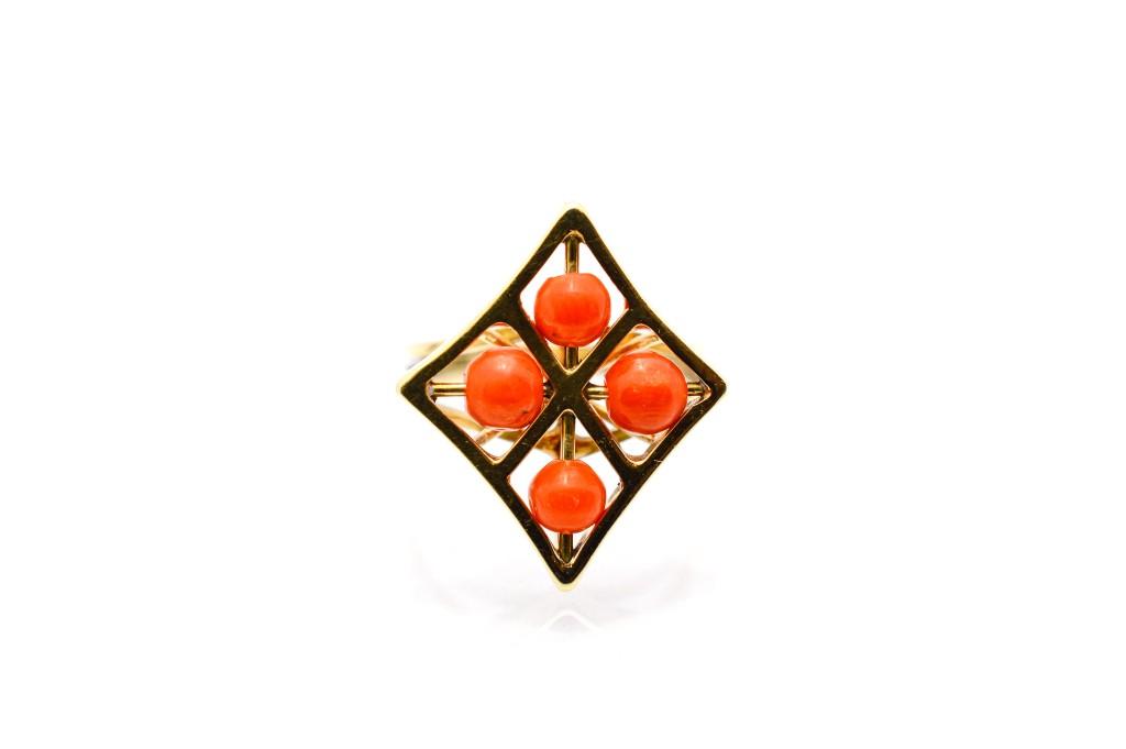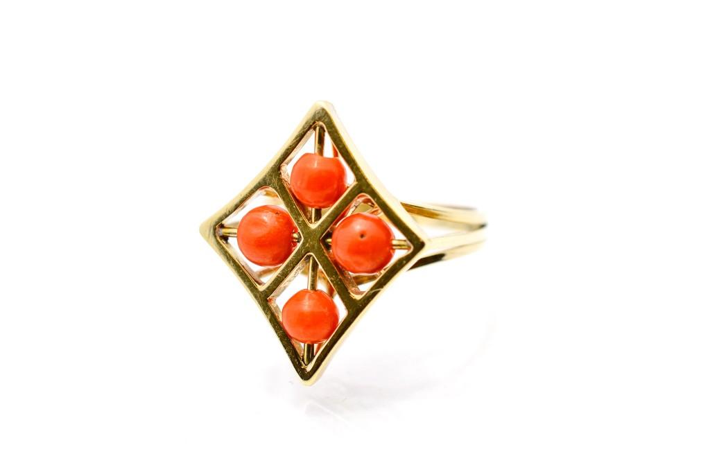 Zlatý prsten s korálem, vel. 55. Váha 5,11 g, ryzost 585/1000, punc labuť. Rozměr hlavy 22 x 18 mm.