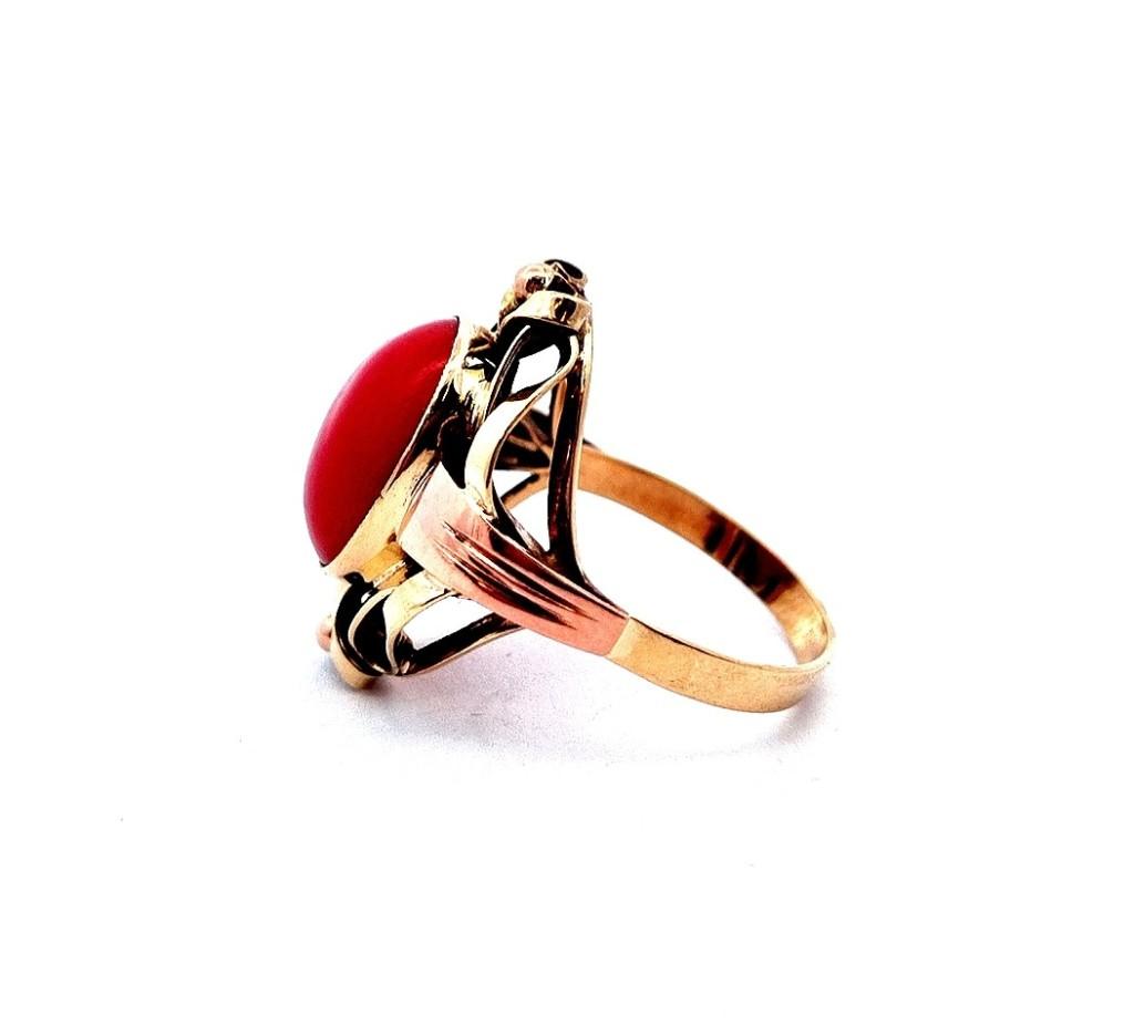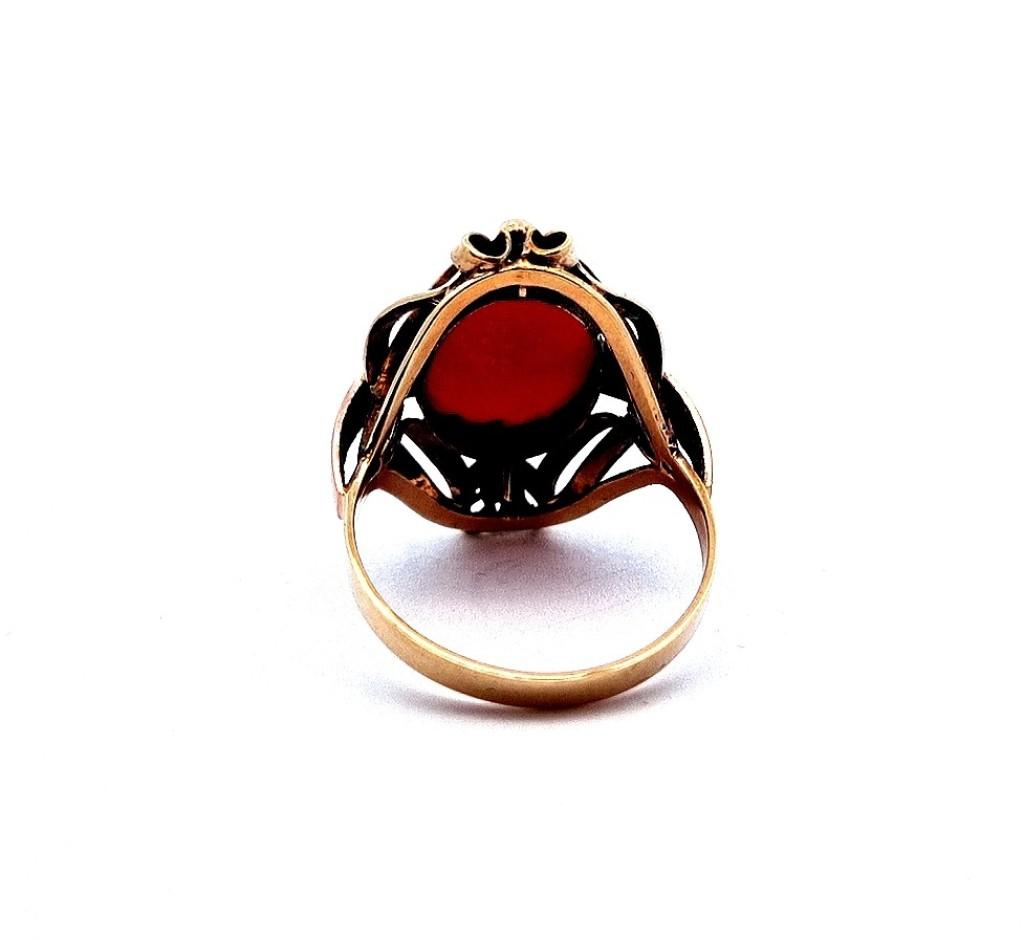 Zlatý prsten o ryzosti 585/1000, punc labuť, váha 5,08 g, velikost 58, v nejširším bodě 23 mm, rozměry kamene - výška 14 mm, šířka 11 mm.