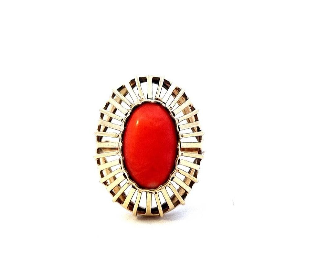 Zlatý prsten o ryzosti 585/1000, punc labuť. Váha 6,55 g, velikost 61, rozměr hlavy prstenu 25 x 20 mm, rozměr korálu 14 x 9 mm.