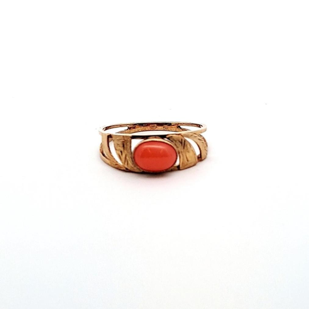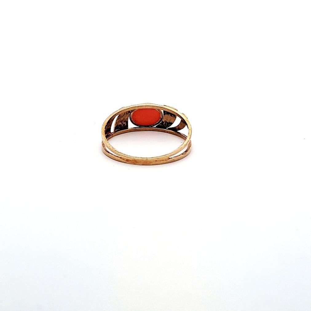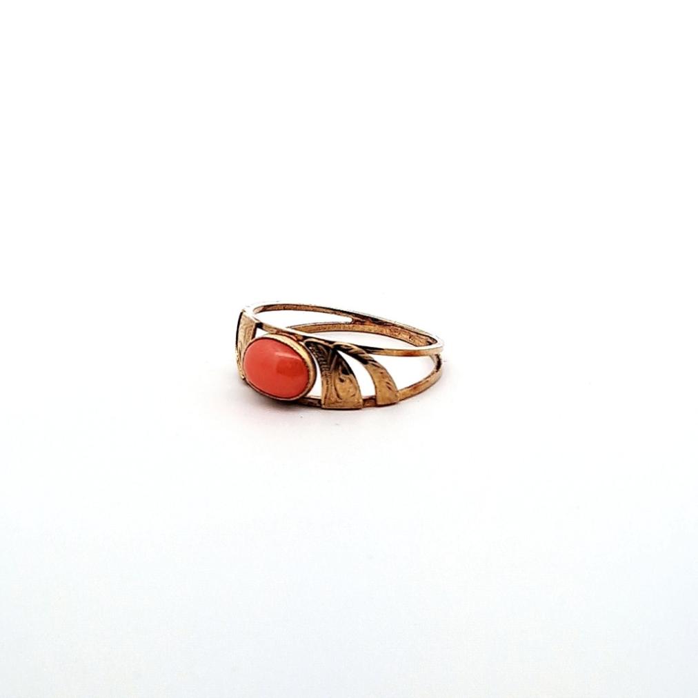 Zlatý prsten s korálem, vel. 61. Ryzost 585/1000, punc labuť. Váha 2,08 g, v nejširším bodě 7 mm.