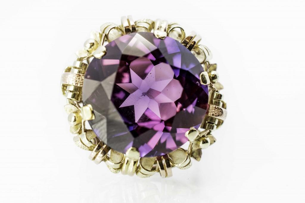 Zlatý prsten o ryzosti 585/1000, váha 10,04g, punc labuť, velikost 56, v nejširším bodě 22 mm. Kámen je syntetický.