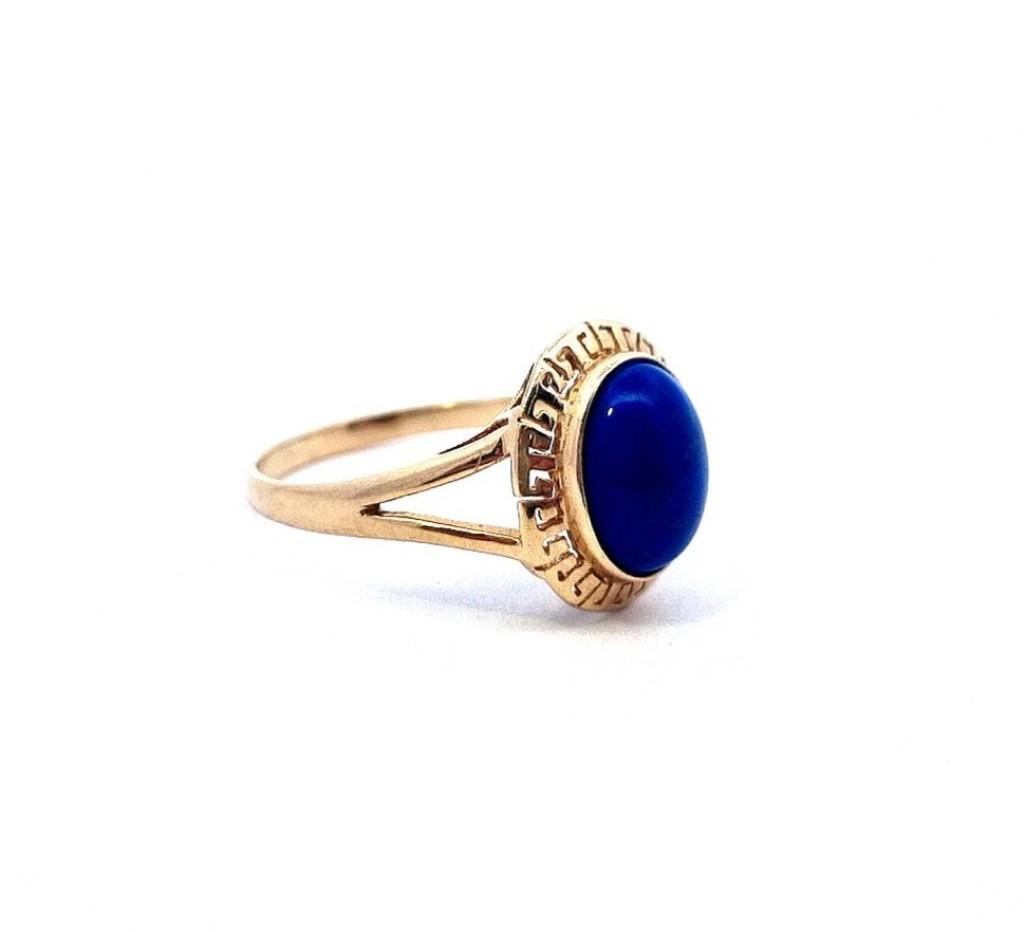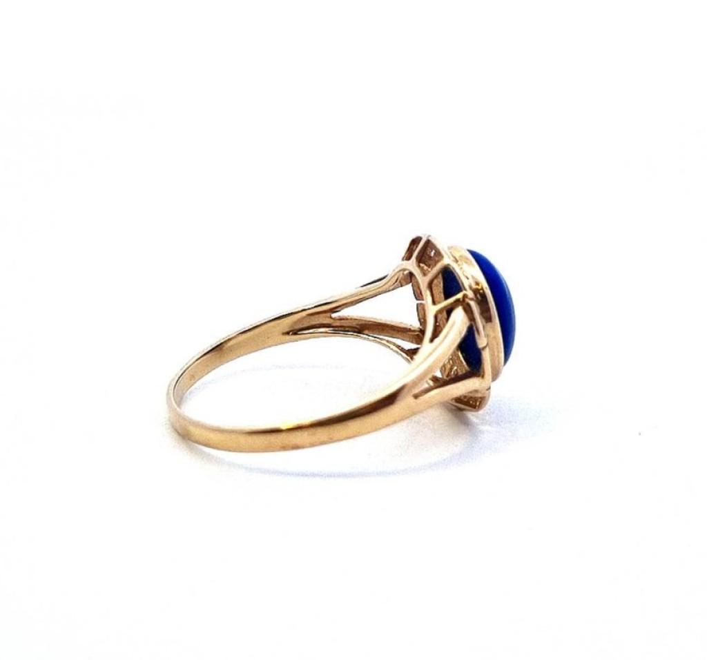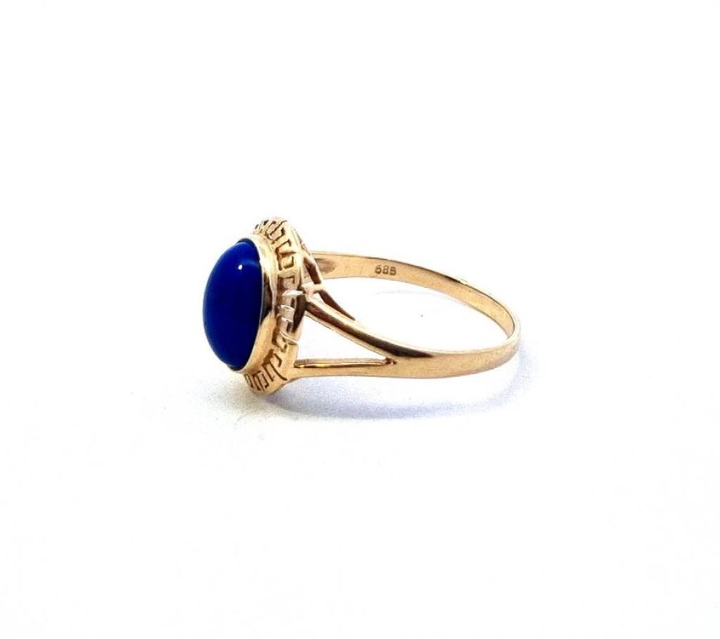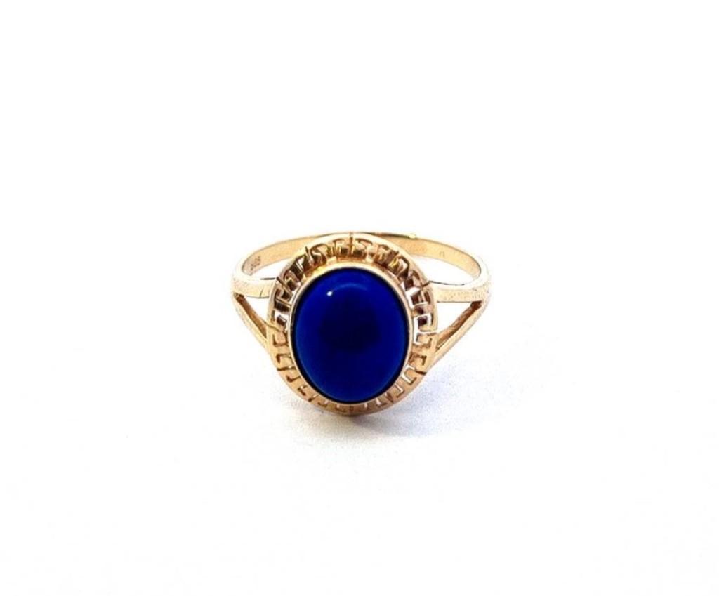 Zlatý prsten o ryzosti 585/1000, váha 2,58 g, punc labuť, kámen lapis lazuli, v nejširším bodě 13 mm, velikost 58.