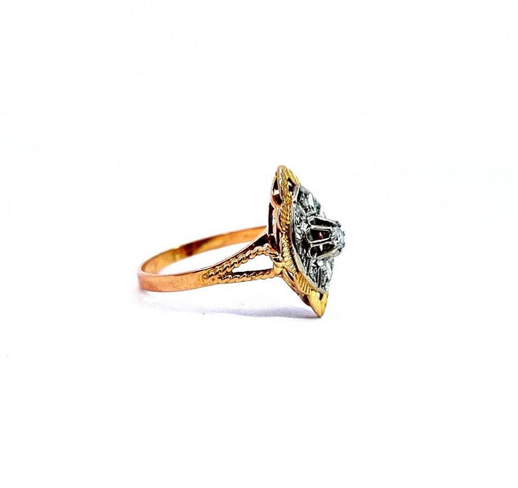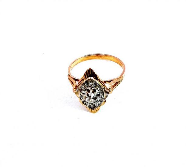 Prsten z kombinace bílého a růžového zlata o ryzosti 750/1000, punc kohout. Velikost 54, váha 2,71 g, rozměr hlavy prstenu 17,5 x 12 mm.