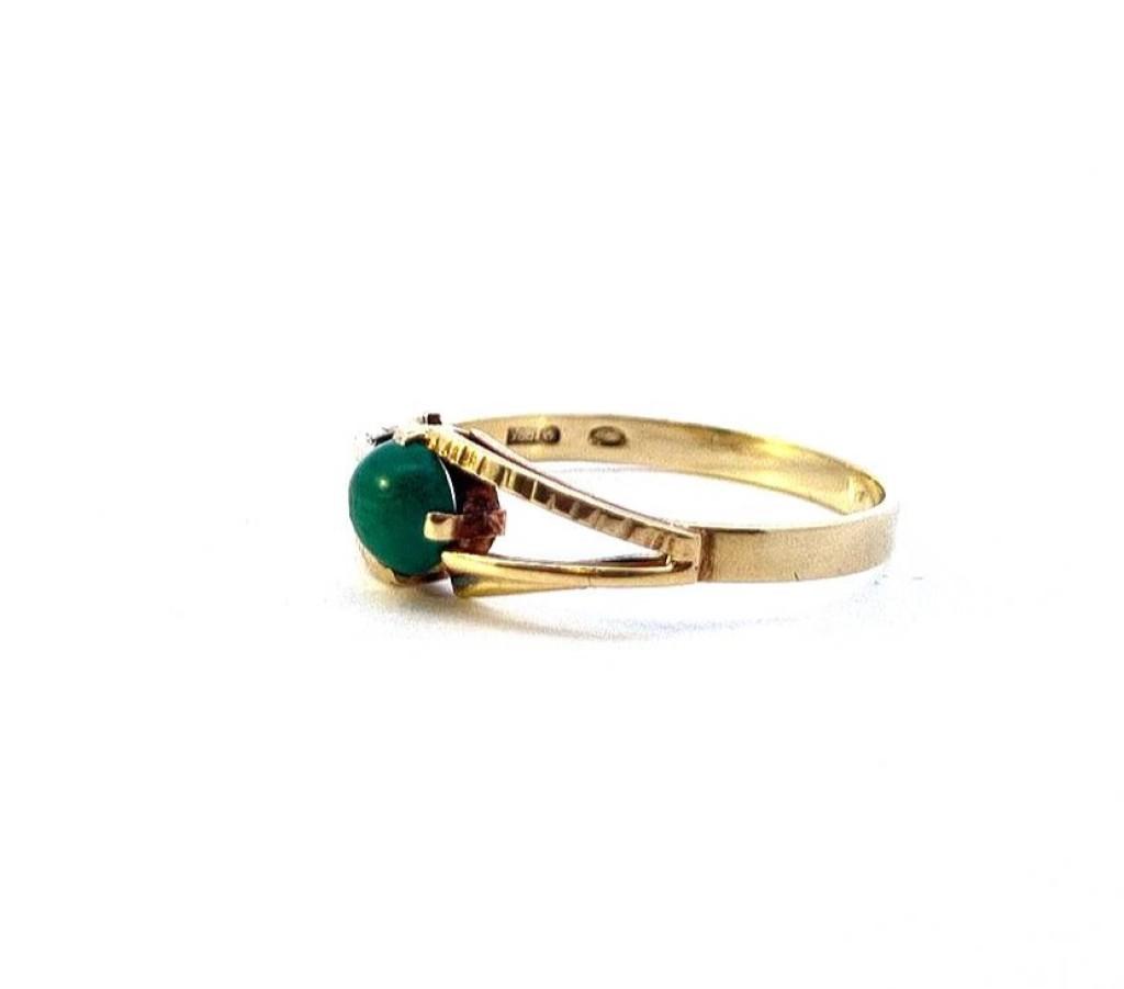 Zlatý prsten o ryzosti 585/1000, punc čejka. Velikost 58, váha 1,95 g, šířka v nejširším bodě 6,5 mm, průměr kamene 5 mm.