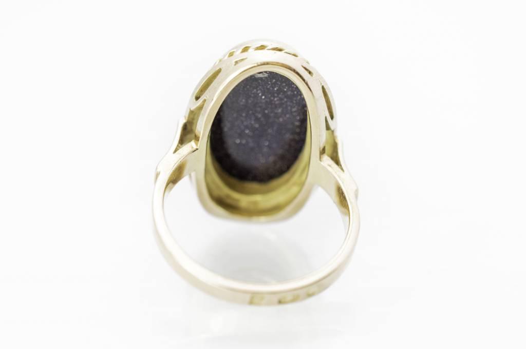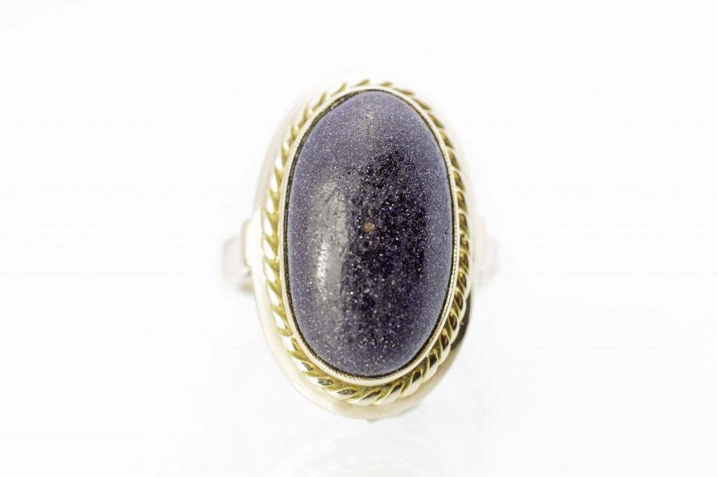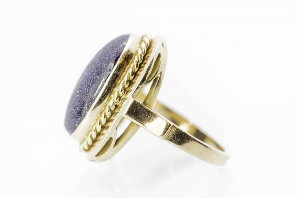Zlatý prsten o ryzosti 585/1000, váha 8,35 g, velikost 54, punc labuť-nově opuncováno, v nejširším bodě 24 mm. Kámen je syntetický modrý avanturín také zvaný jako ´´arabská noc´´