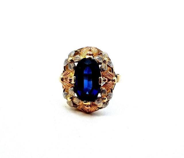Zlatý prsten o ryzosti 585/1000, punc labuť, váha 6,11 g, velikost 53, v nejširším bodě 20 mm, rozměry kamene - výška 13 mm, šířka 8 mm. Kámen je syntetický.
