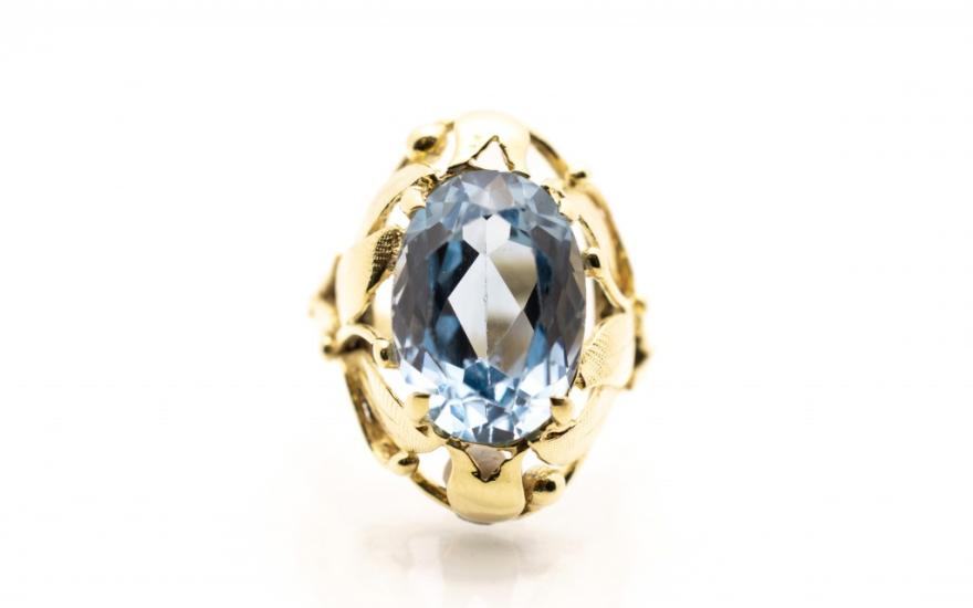 Zlatý prsten o ryzosti 585/1000, punc čejka, váha 5,34 g, velikost 52, v nejširším bodě 22 mm, rozměry kamene - výška 14 mm, šířka 9 mm.