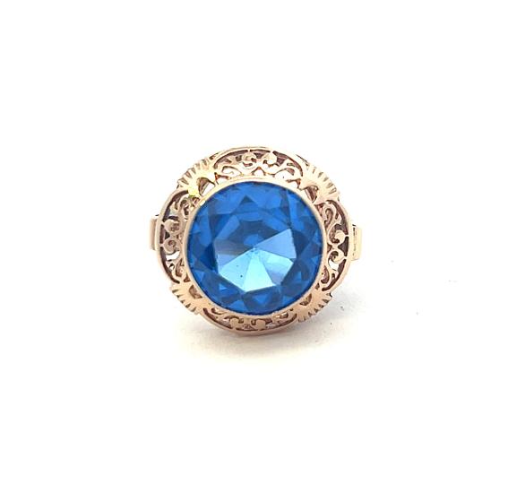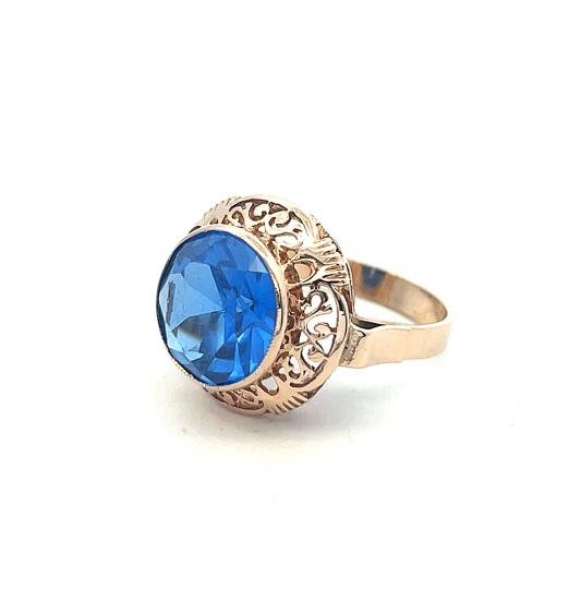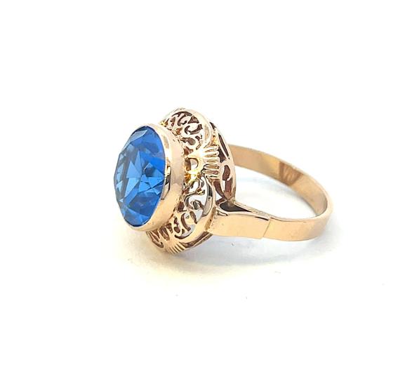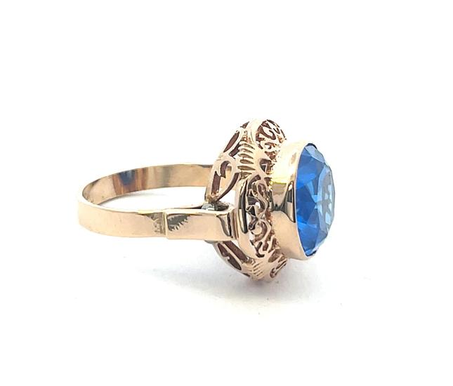Zlatý prsten o ryzosti 585/1000 s velkým modrým kamenem. Prsten je opuncovaný platným polským puncem. Váha 5,99g. Velikost 56. Průměr hlavy prstenu je 17 mm. Průměr kamene je 12 mm. Kámen je syntetický.