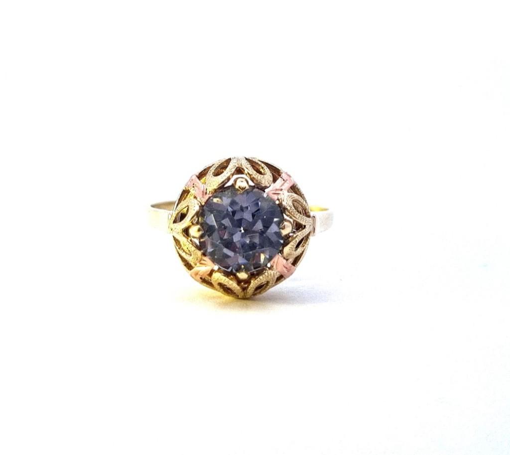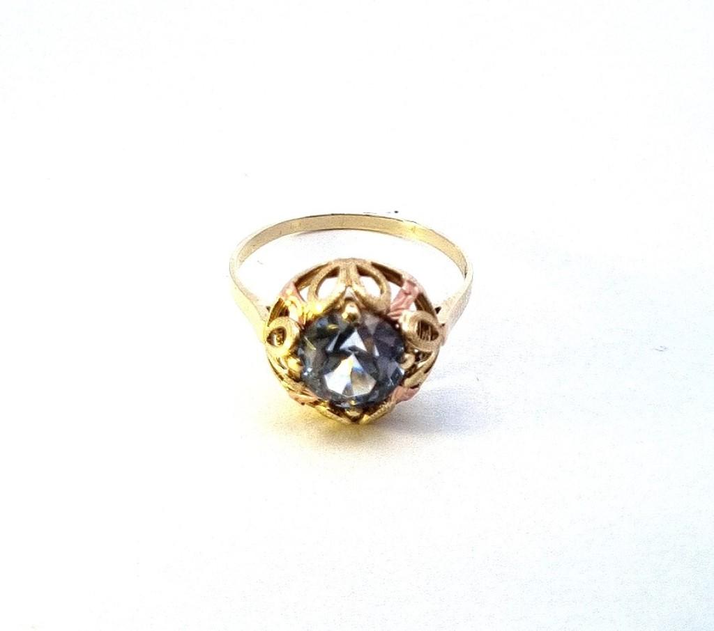 Zlatý prsten o ryzosti 585/1000, punc labuť. Velikost 58,5, váha 3,44 g, průměr hlavy prstenu 13 mm, průměr kamene 8 mm. Kámen je syntetický.