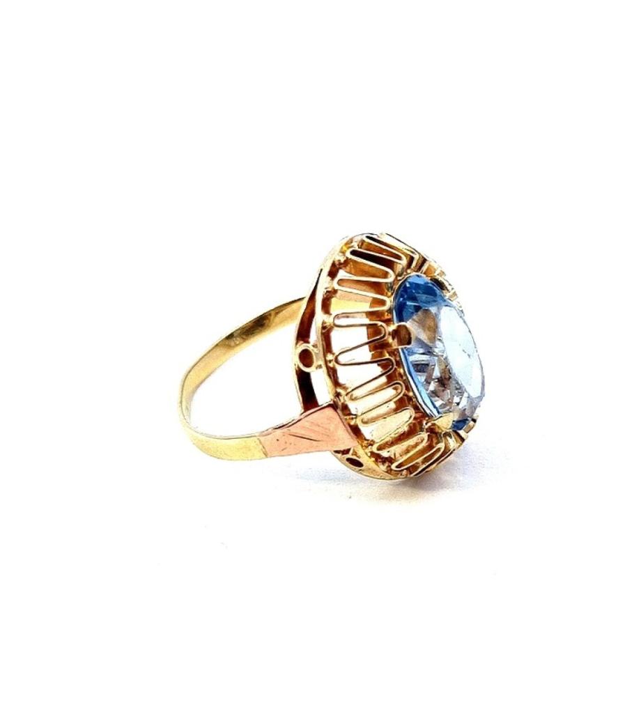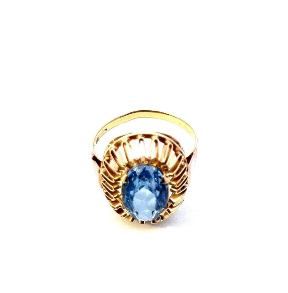 Zlatý prsten o ryzosti 585/1000, punc čejka. Velikost 61, váha 6,06 g, rozměry hlavy prstenu 22 x 17 mm, rozměry kamene 14 x 9 mm. Kámen je syntetický.