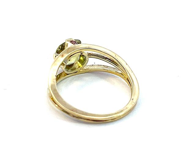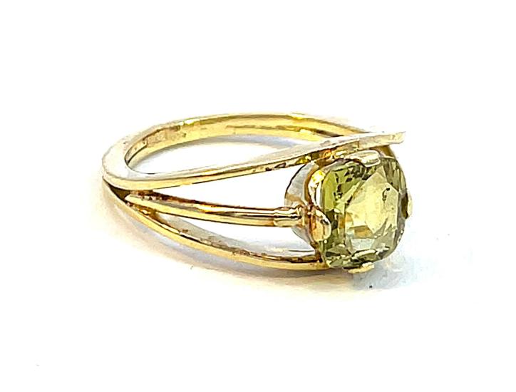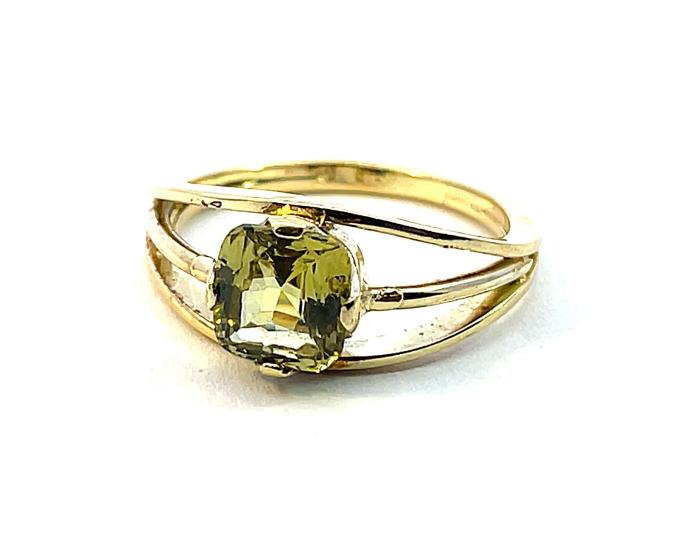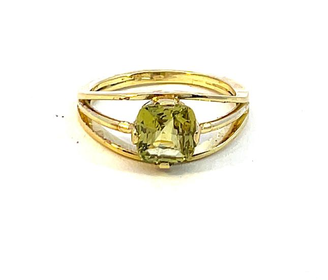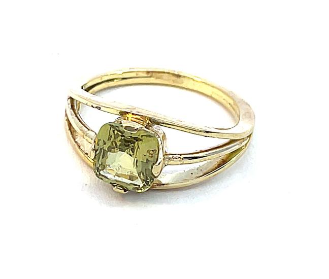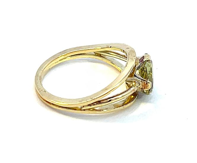 Zlatý prsten o ryzosti 585/1000, punc labuť. Váha 3,10 g, velikost 51,5, v nejširším bodě 8 mm. Kámen je syntetický.