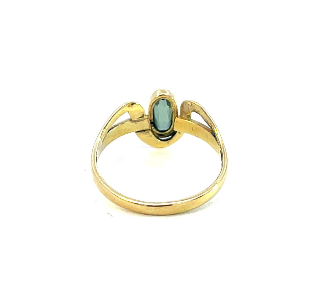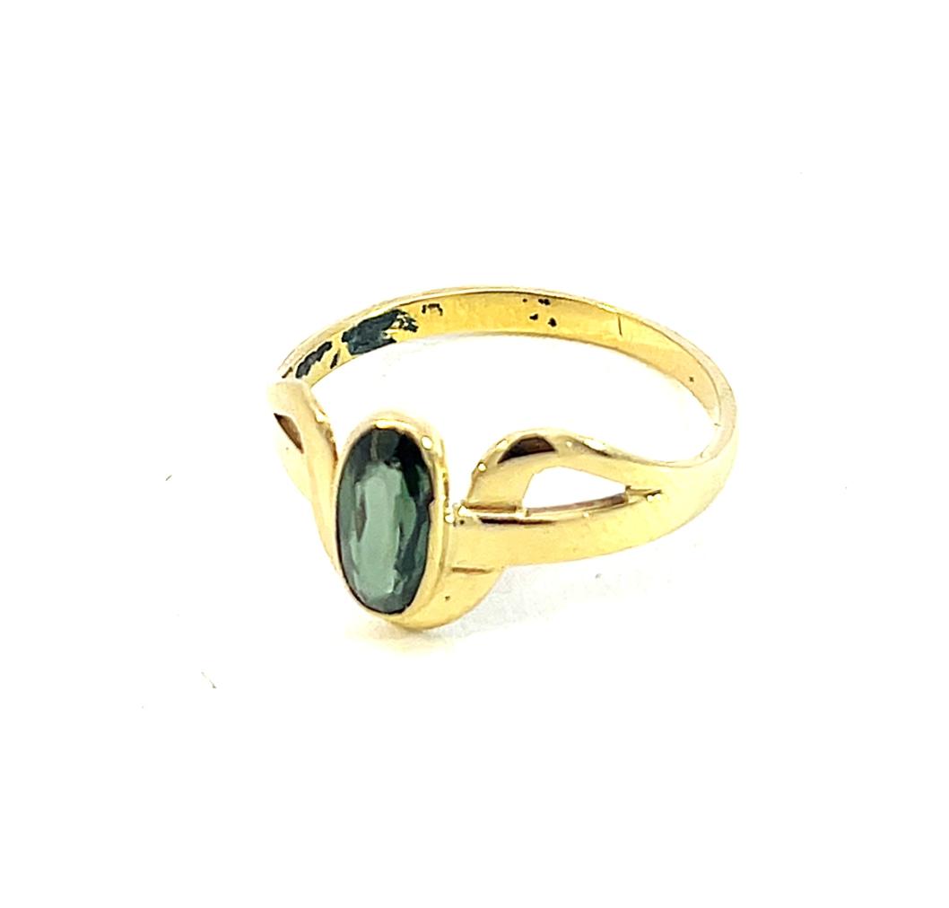 Zlatý prsten o ryzosti 585/1000, punc labuť. Velikost 53, váha 2,03 g, v nejširším bodě 10 mm, rozměr kamene 8 x 4,5 mm. Kámen je syntetický.