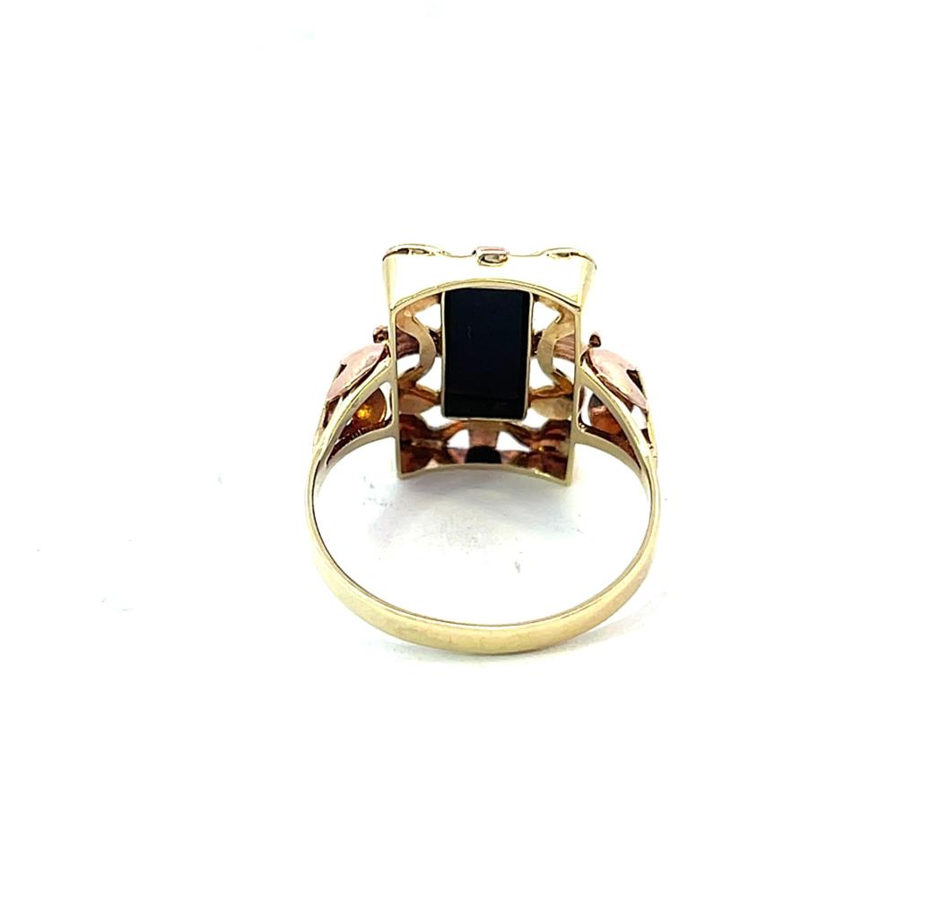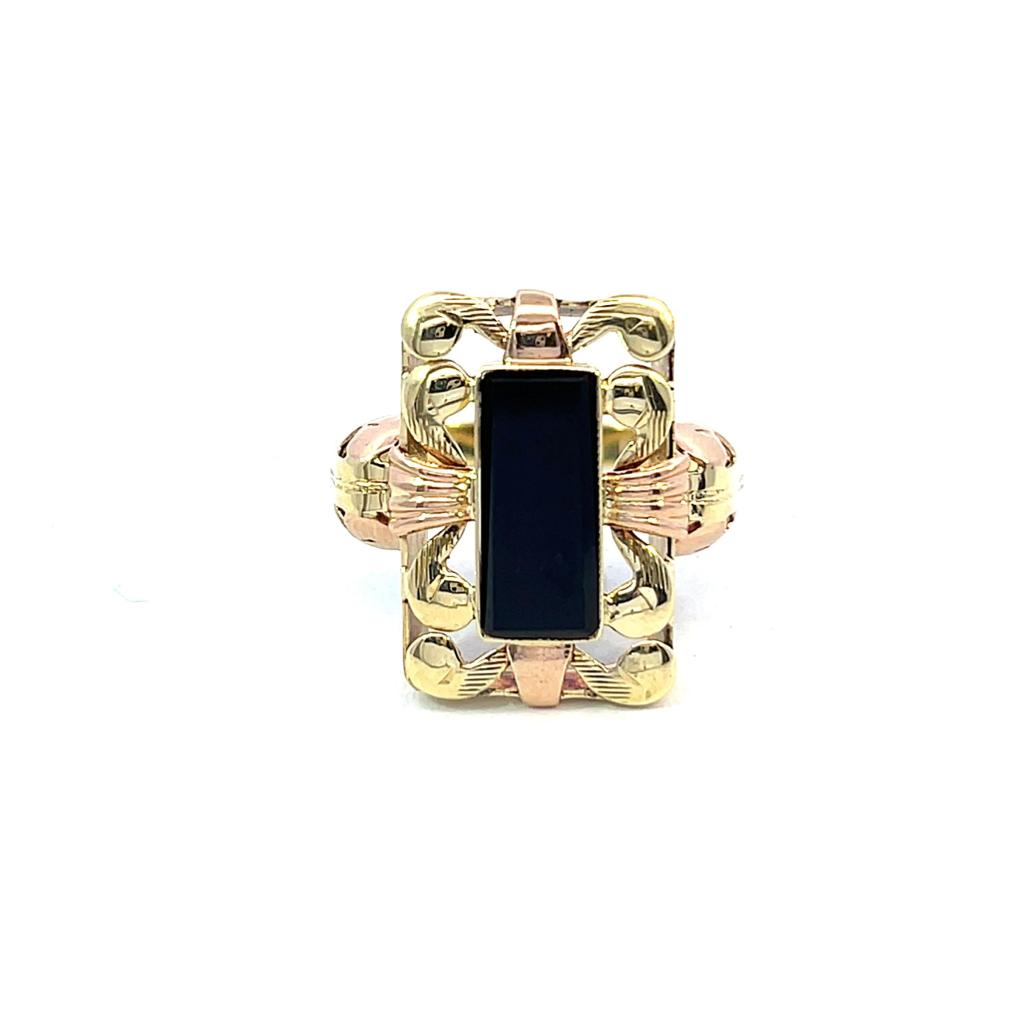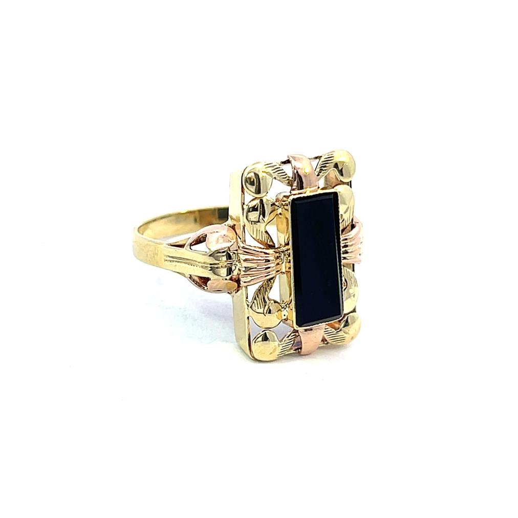 Prsten z kombinace žlutého a růžového zlata o ryzosti 585/1000, punc čejka. Váha 3,58 g, velikost 57, rozměr hlavy prstenu 19 x 12 mm.