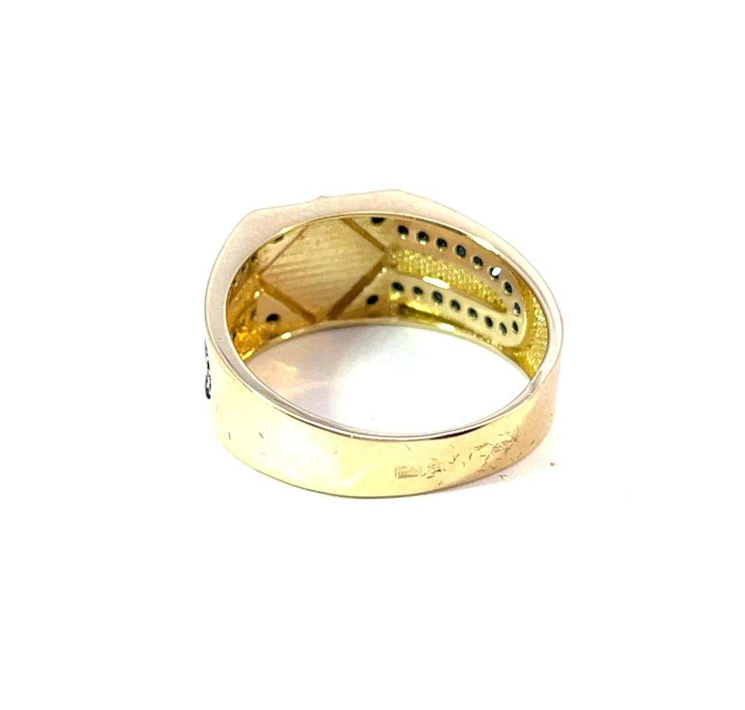 Zlatý prsten o ryzosti 585/1000, platný maďarský punc. Velikost 58, váha 4,32 g, v nejširším bodě 9 mm.