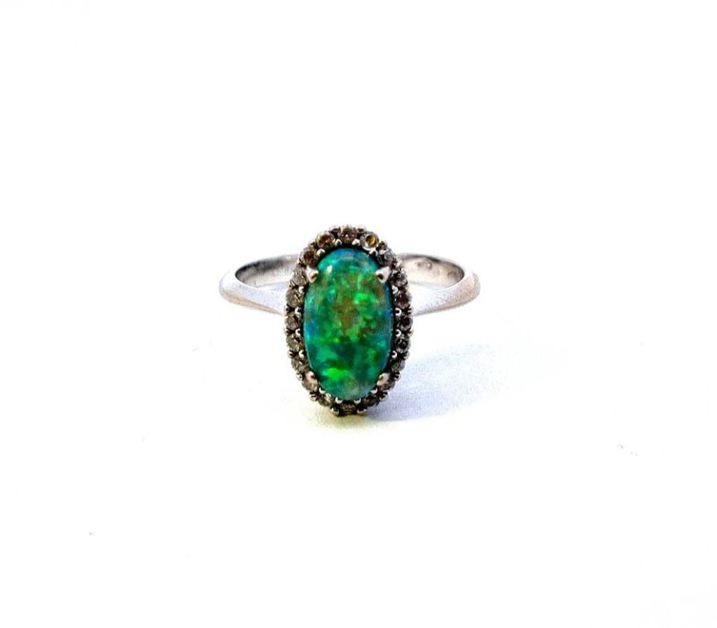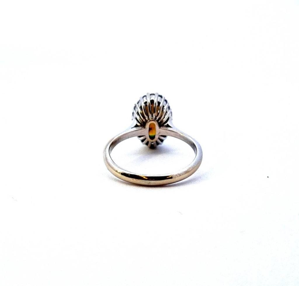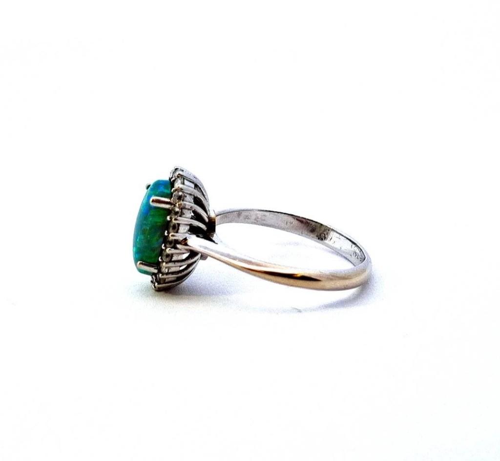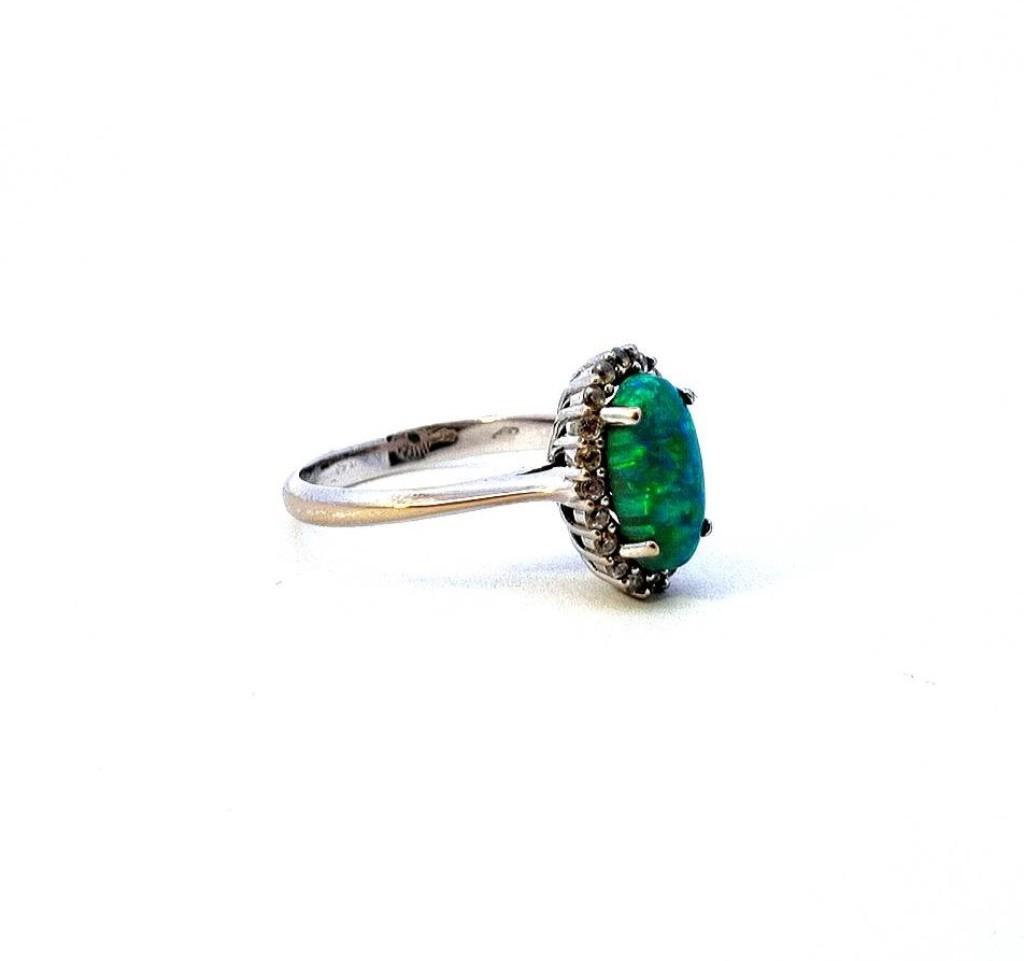 Zlatý prsten z bílého zlata o ryzosti 585/1000, punc labuť. Velikost 51, váha 2,90 g, rozměry hlavy prstenu 13 x 8,5 mm. Kameny jsou syntetické.