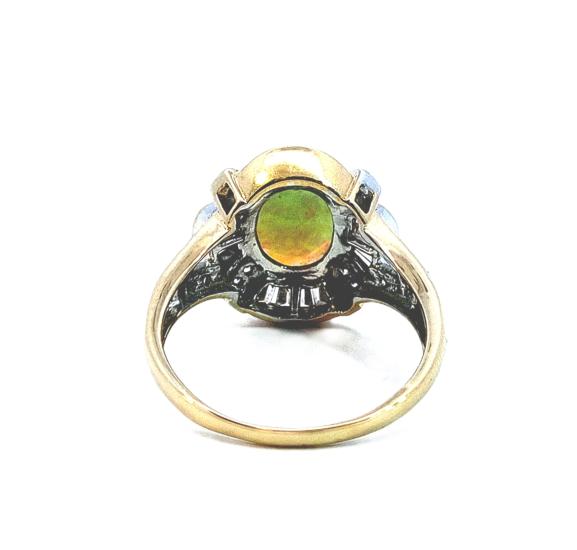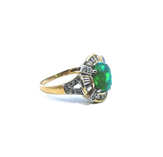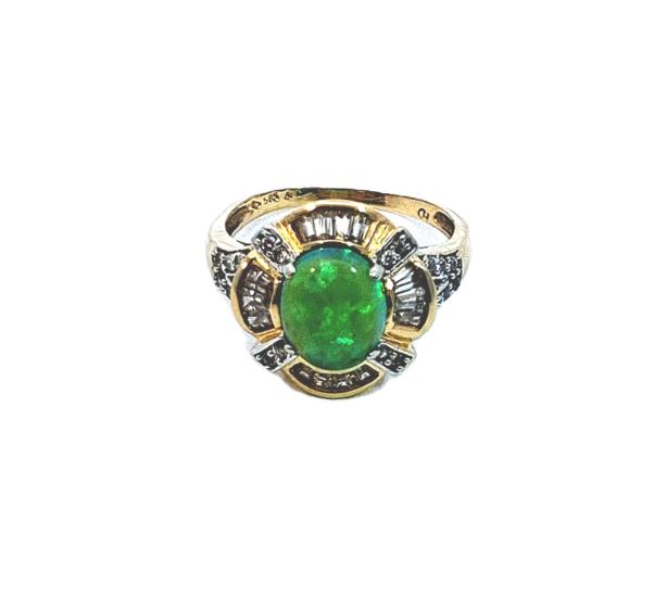 Prsten z kombinace žlutého a bílého zlata o ryzosti 585/1000, punc labuť. Velikost 58, váha 4,48 g, rozměr hlavy prstenu 16 x 15 mm. Kameny jsou syntetické.