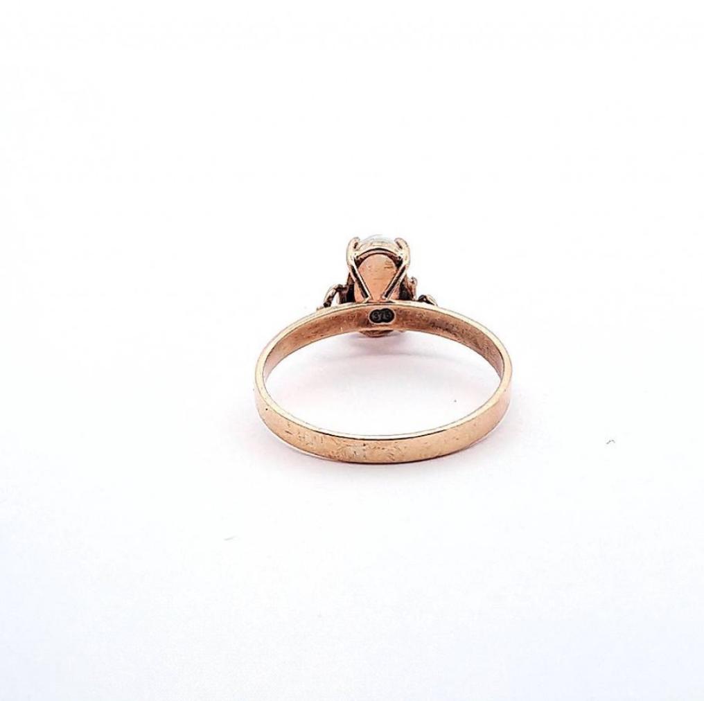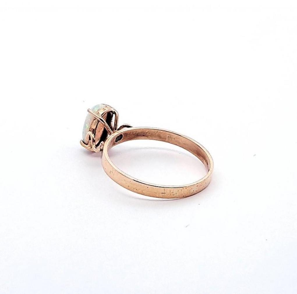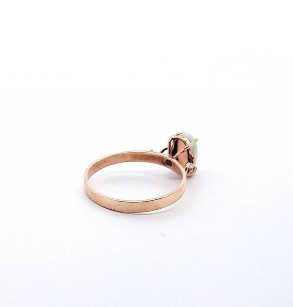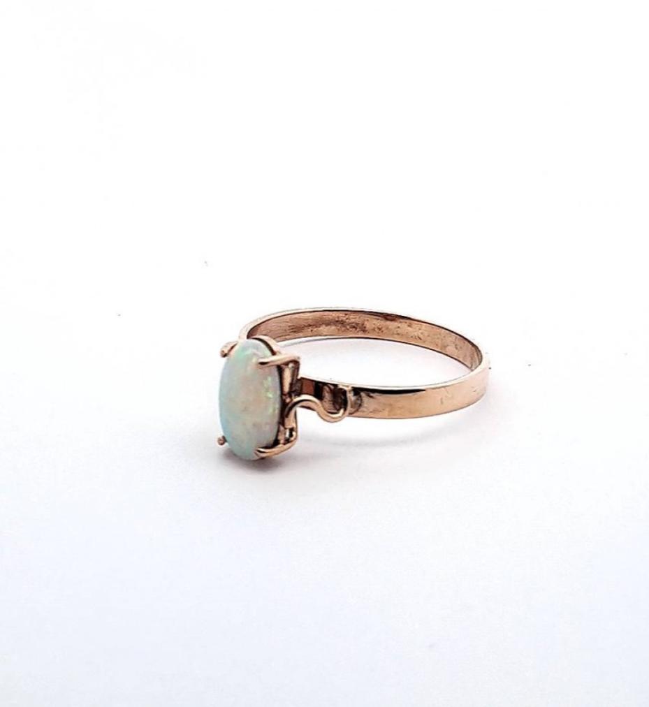 Zlatý prsten z růžového zlata se světlým opálem. Zlato o ryzosti 375/1000 s puncem Z a slunce. Váha 1,74 g, velikost 57. Velikost opálu je 9 x 5 mm. Šířka obroučky je 2 mm.