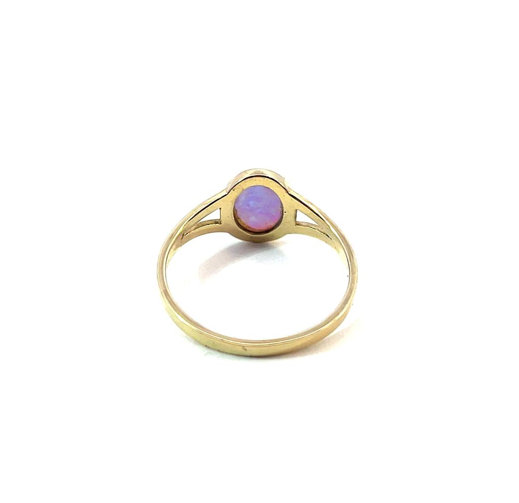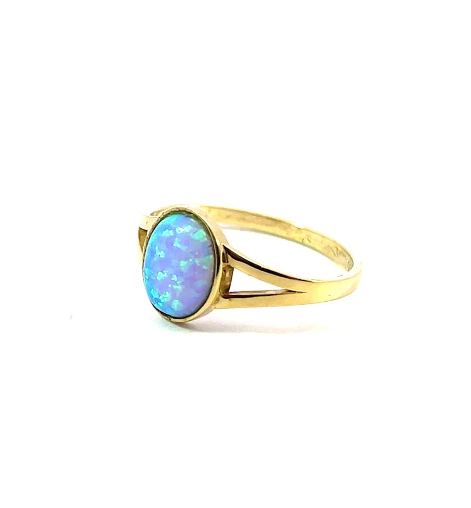 Zlatý prsten o ryzosti 585/1000, punc labuť. Velikost 58, váha 2,02 g, v nejširším bodě 10 mm. Kámen je syntetický.